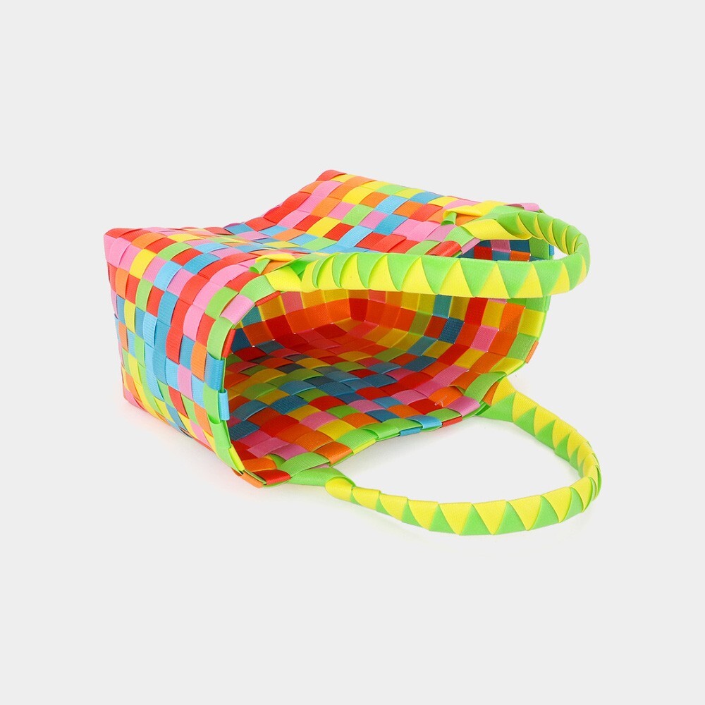 Turn heads with this mini basket weave micro tote bag, featuring a vibrant multicolor design and sturdy top handle. The compact size makes it perfect for carrying your must-haves while keeping your look effortlessly stylish. Whether you're out for coffee or hitting a weekend market, this woven purse adds the perfect pop of texture and color to any outfit. • Size : 10.5" X 5.75" X 3.75" • Top Handle Size : 4" L