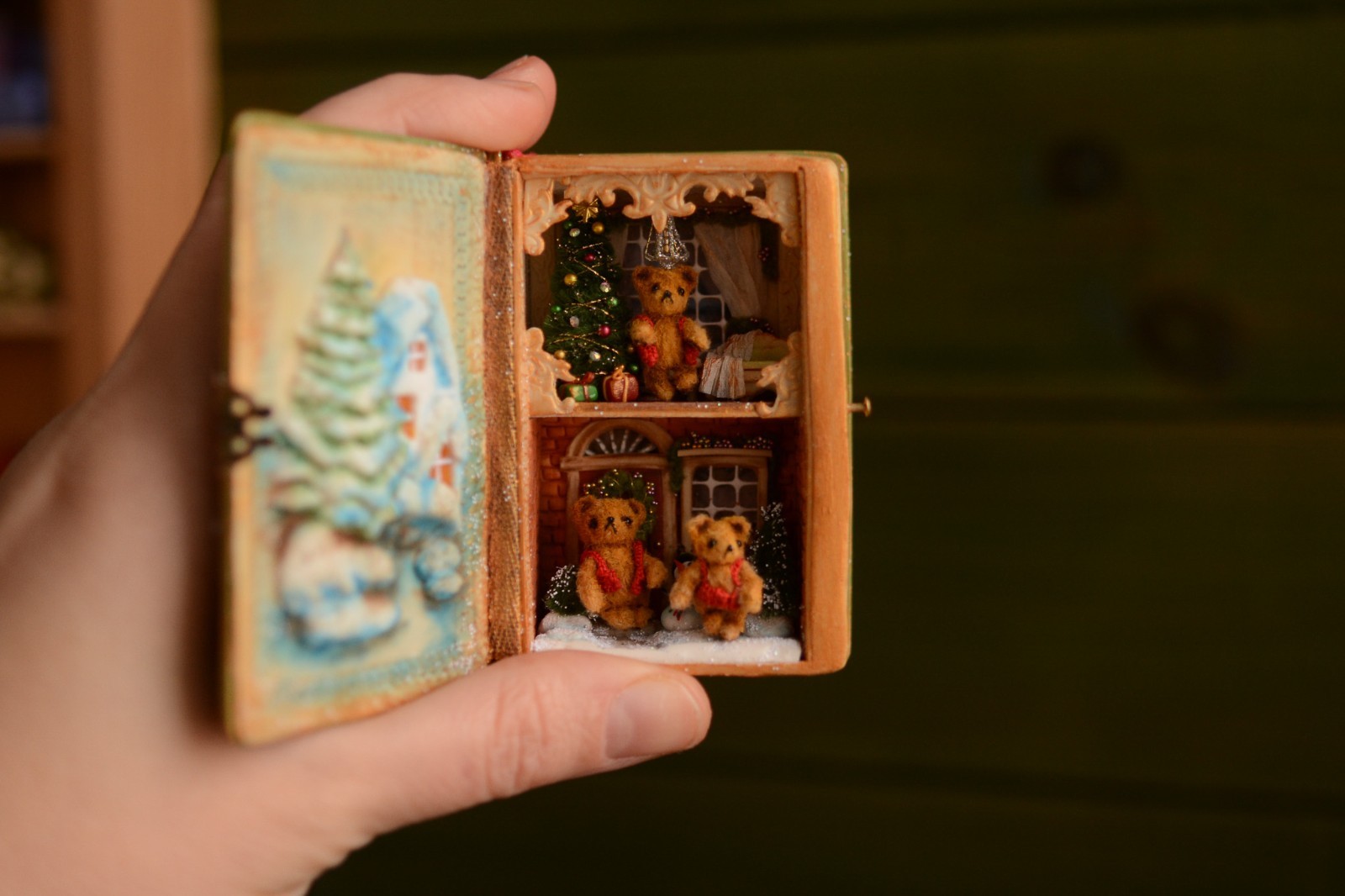 Hi Friends! Let me introduce you to my OOAK handmade miniature bears in a Christmas box This is collaborative work. Tatiana Nechiporenko makes the box house. *** Each limb was crocheted separately and then thread-shaped. Painted with oil He is 5-way thread jointed. It means that the head and the limbs are movable. *** Size: height is nearly 1.5 cm Materials: yarn, sewing thread, glass beads *** Not suitable for children due to the small size. A toy for display, not for play. *** Packed with eco-friendly materials. So you may recently gift it, or just enjoy it yourself! *** Made in a smoke-free home. *** Please note - Colors may vary slightly on your computer screen.