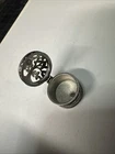 The Miniature Tree of Life keepsake box is a round, silver tone metal box featuring a tree pattern on its lid. It is designed as a miniature decorative piece with a magnetic closure, making it ideal for storing small trinkets or precious items. The silver finish adds a touch of elegance to the piece, making it a charming addition to any collection of keepsake boxes. Please see photos for condition. Please feel free to contact us with any questions before purchasing.