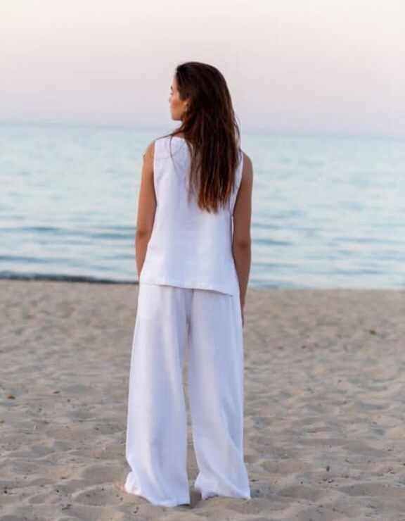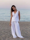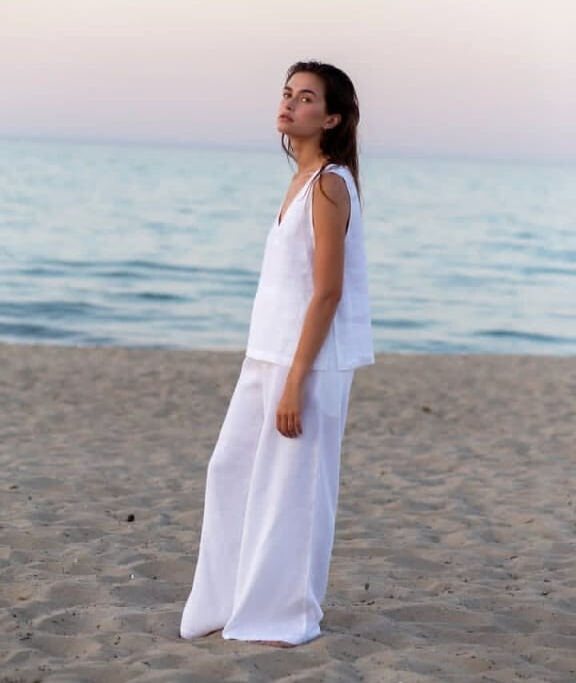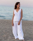 Craft your look with this chic white linen top and palazzo pants dress, perfect for beach outings or cocktail parties. Featuring a relaxed fit design, this ensemble offers the epitome of comfort and style. The breathable, lightweight linen material ensures you stay cool and unrestricted, ideal for the warmer spring and summer months. With its solid white color, this dress exudes a minimalist vibe, allowing you to accessorize to your heart's content. The elastic waist on the pants provides a snug, adjustable fit without compromising on the effortless aesthetic.