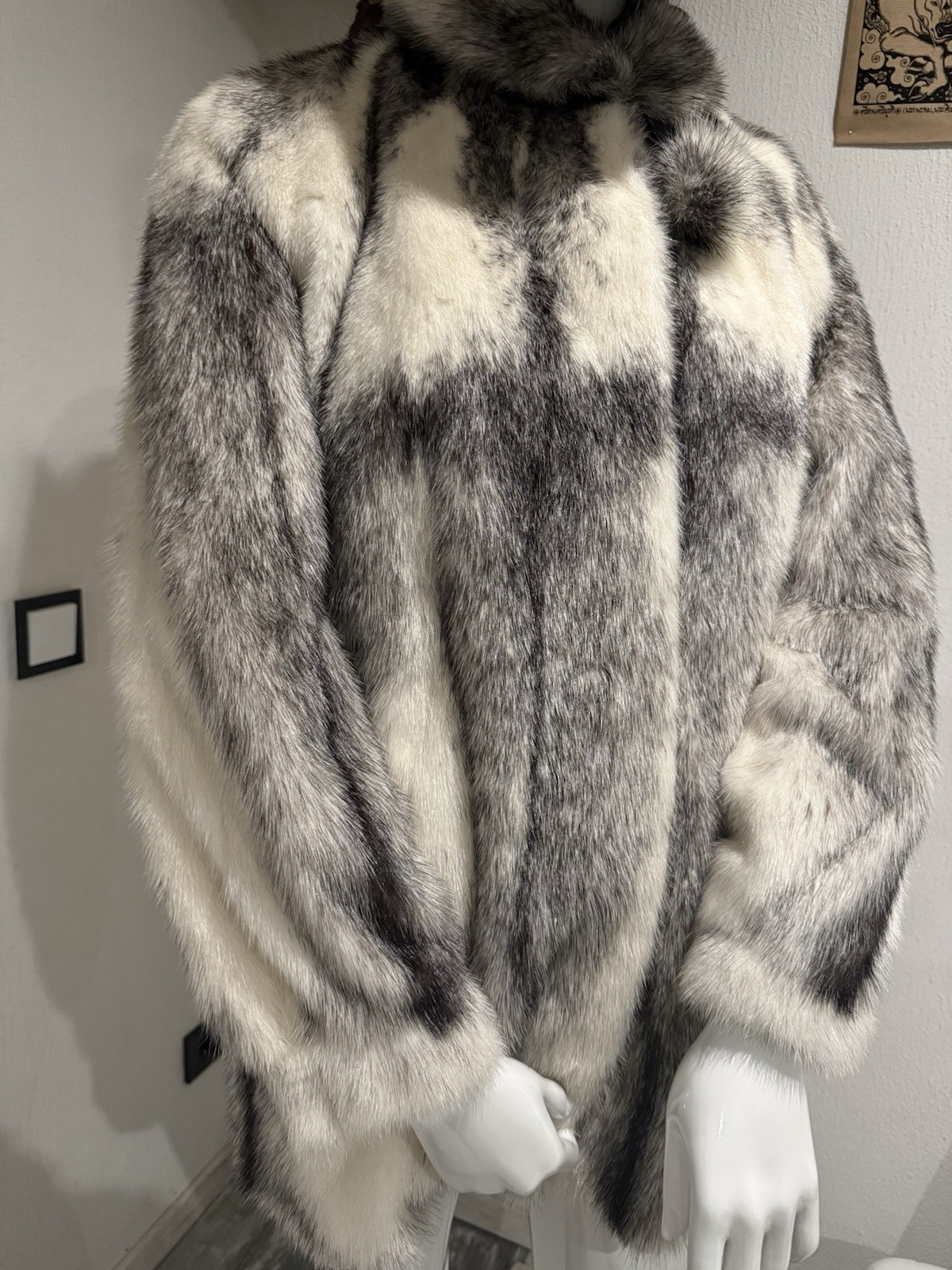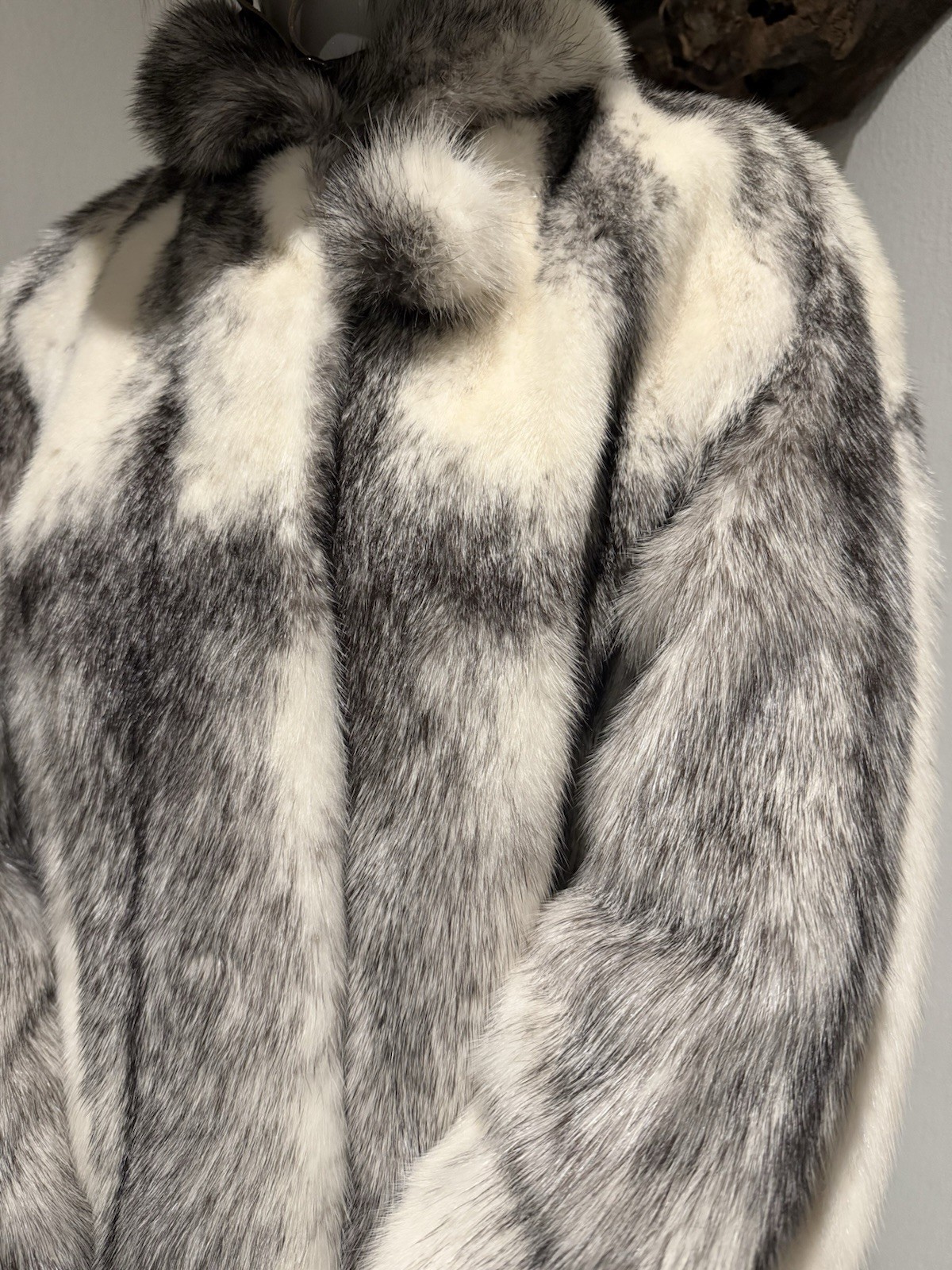 Sehr schöne Cross Mink Jacke mit einem wunderschönen Kreuzmuster. Der Zustand der Jacke ist sehr gut erhalten, lediglich am Kragen gibt es leichte Oxidationsspuren, was bei weißem Pelz völlig normal ist. Dies hat keinerlei Auswirkungen auf das Tragegefühl. Das Innenfutter und die Außenseite sind intakt und ohne Beschädigungen. Die Pelzlederseite ist sehr weich.