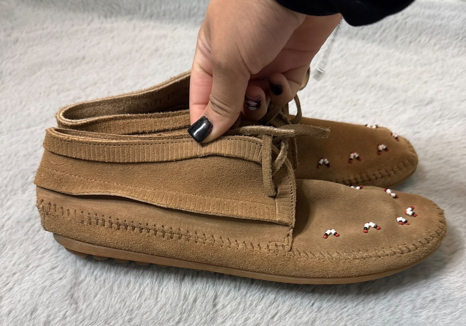 Condition: Excellent pre-owned condition; no rips, stains or tears Size: Women's 10 Color: Brown with multi-colored beading Minnetonka Thunderbird Moccasins, an iconic style known for its distinctive hand-beaded design. Material: They are made from soft, genuine suede or smooth leather. Design: The shoes feature a traditional hand-beaded "thunderbird" motif on the vamp in red, white, and black colors, as well as rawhide lacing. Sole: Hardsole is lightweight, flexible rubber sole suitable for indoor and outdoor wear. Non-smoking and pet free environment. Fast shipping. SHIPS FROM THE USA (TEXAS). Take a look at my other items to bundle shipping! **Colors of items or embellishments may appear darker or lighter depending on devices and screen display settings. Size estimations and measurements in photos and listing details are provided for informational purposes only and are not guaranteed to be accurate. Vintage items may differ from modern day sizes - please check all measurement approximations carefully to ensure fit. While I do accept returns within a certain time period for most of my items, shipping for returns for any of these issues is at the buyers expense.