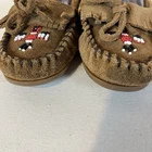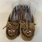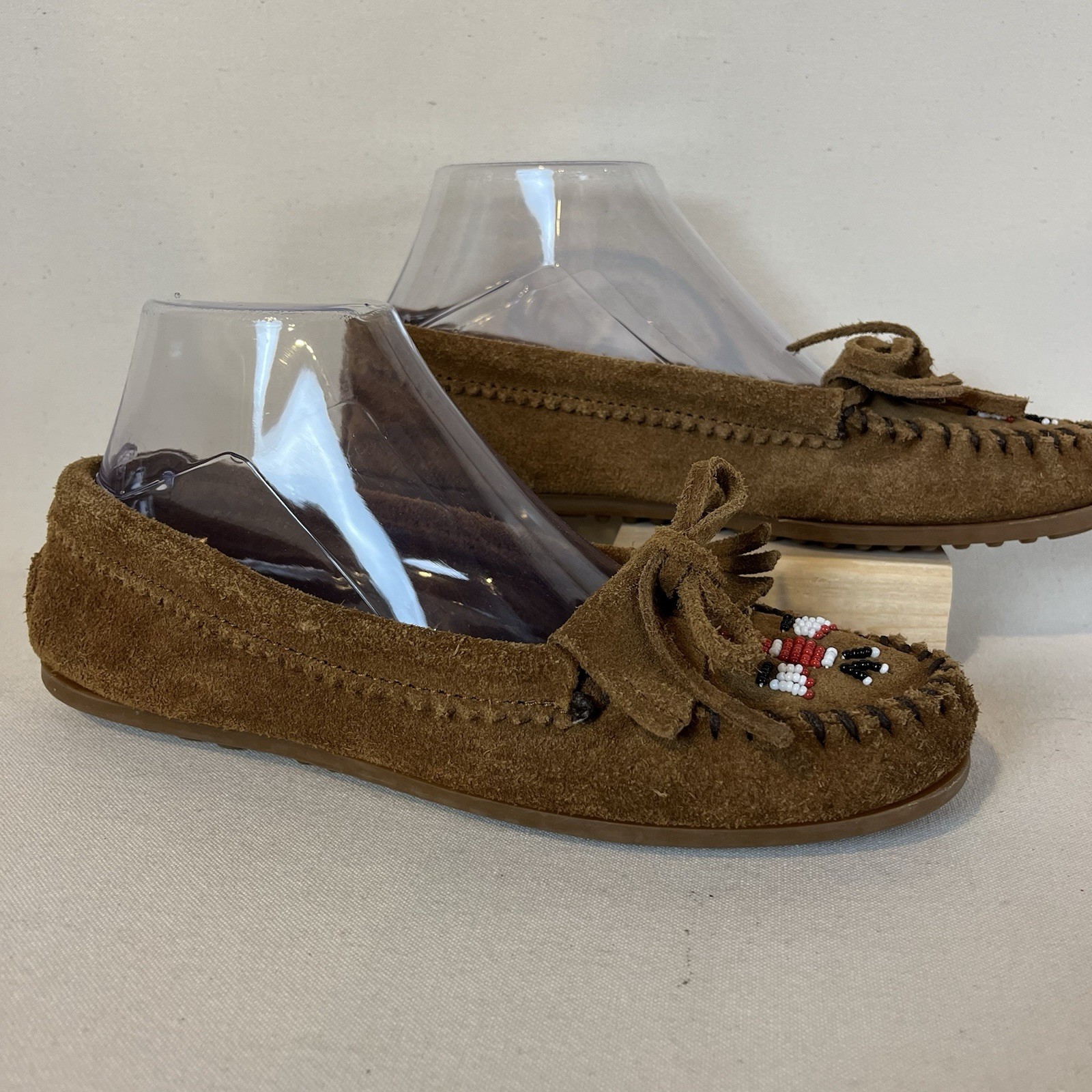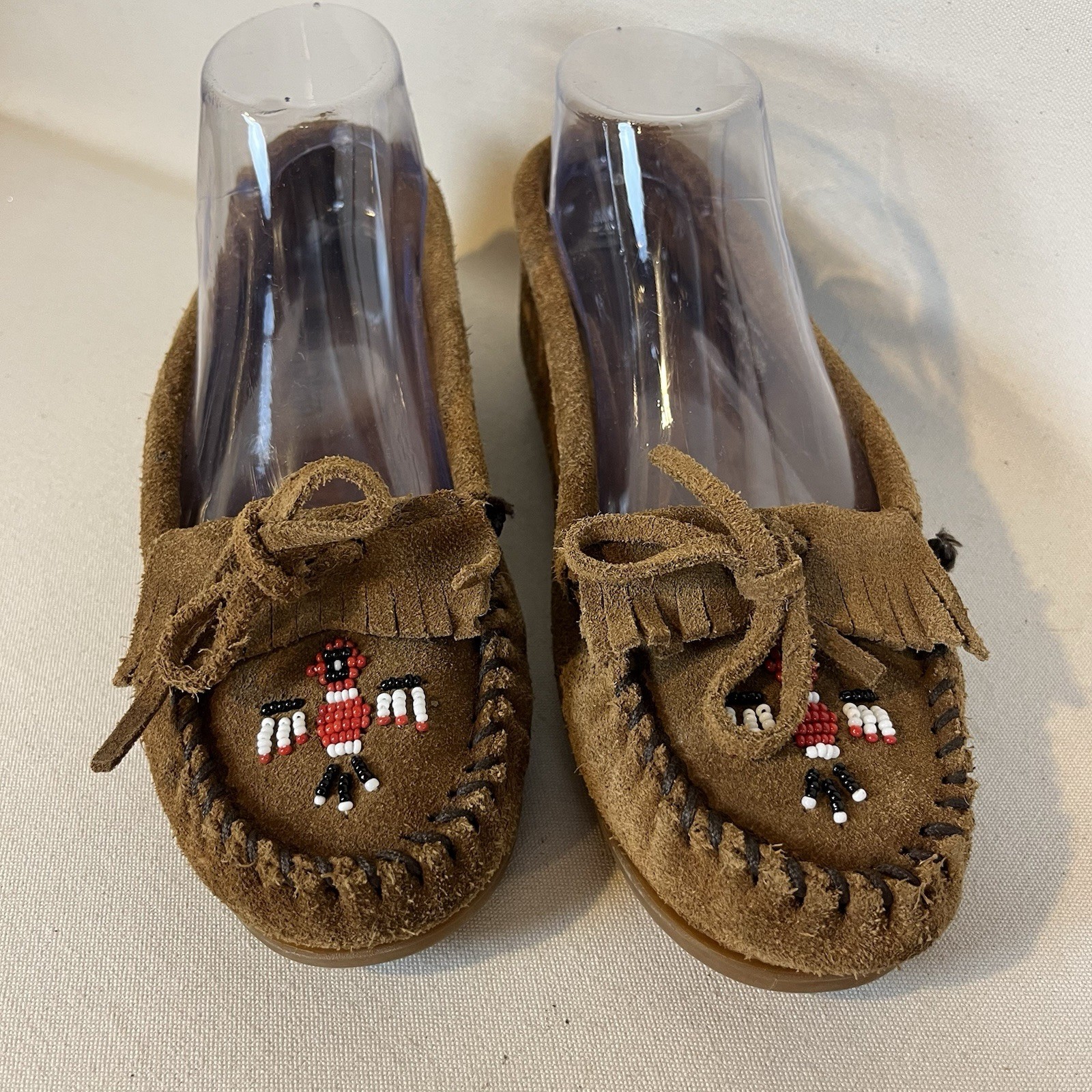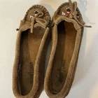 Beautiful Minnetonka moccasins in great condition. Beautiful beadwork, front tie with fringe area. Beautiful shoe for comfort.