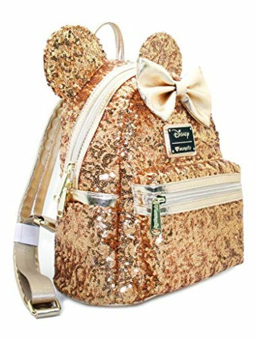 Exclusive Disney Yellow Gold Sequin Minnie Mouse Mini Backpack & Keychain *2 PIECE SET* Factory Sealed Package **Includes a Mickey Mouse Gold Sequin Keychain** LOUNGEFLY & DISNEY EXCLUSIVE!! Stay golden in this one of a kind Disney sequin Minnie backpack! Mickey's golden girl Minnie sparkles in this super cute all yellow gold sequin mini backpack from Disney! Complete with her classic ears and bow, the allover yellow gold sequin Minnie mini backpack sold out! Exclusive Disney Sequin Minnie Mini Backpack Width: 9" x Height: 10.5" x Depth: 4.5" PU Leather / Full-on sequin Minnie mouse ears and large bow accent Top handle Dual reinforced padded shoulder straps Front exterior zipped pockets / two sides exterior pockets Fully lined interior Yellow Gold Top zip closure