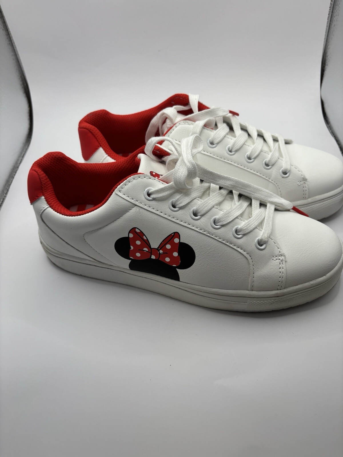 Minnie Mouse sneakers, perfectly sized for women's US size 7 (UK size 4.5). The vibrant red and white color scheme brings a playful touch to any outfit, while the durable polyurethane upper ensures your feet stay supported whether you're strolling through the park or the city streets. Lace-up closure provides a secure fit, ensuring these shoes are as practical as they are charming. Almost new, I only use it 2 times is Disney last December 2024. Because I loose weight and I bought it in July 2024, they are large for me now.