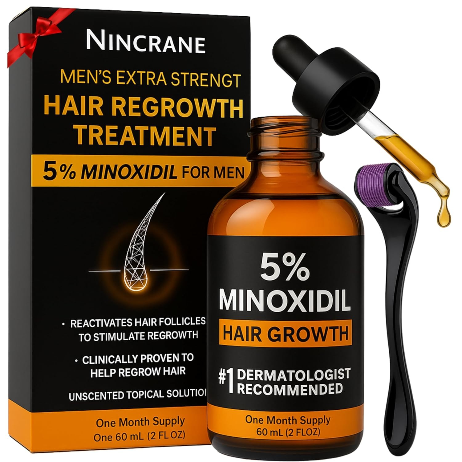 Minoxidil for Men 5% Extra Strength Hair Regrowth Treatment – Beard Growth, Scalp & Hair Loss Solution – Topical Serum with Dropper – Thicker, Fuller Hair – 2oz Product Details Brand: Nincrane Item Weight: 0.11 Kilograms Item Form: Drop Hair Type: all hair types Unit Count: 2 Fluid Ounces Powerful 5% Minoxidil Formula Supports hair and beard regrowth by targeting inactive follicles. Designed for men dealing with thinning hair, receding hairlines, or uneven beard growth. For Thicker, Fuller Hair & Beard Regular use supports denser, healthier-looking hair. Whether you're aiming for a stronger hairline or a fuller beard, this solution helps you achieve visible improvements. Easy-to-Apply Dropper Design Comes with a precision dropper for targeted, mess-free application directly to problem areas. Quick-drying, non-greasy formula integrates seamlessly into your grooming routine. Safe & Dermatologist Recommended Developed with safety in mind, this topical treatment is backed by dermatologists. Free from harsh additives and designed specifically for men's hair regrowth needs.
