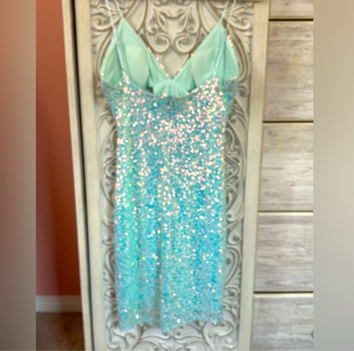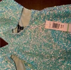 Aqua mini sequin party dress by Jump, size 7/8, features a V-neckline, sleeveless style, and cutouts at the waist. Made of polyester with a zip closure, this short dress is perfect for formal events or clubwear. The mermaid and sexy themed dress is adorned with colorful sequins, making it a standout piece for parties and cocktail events. Made in Vietnam.
