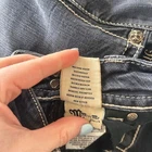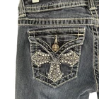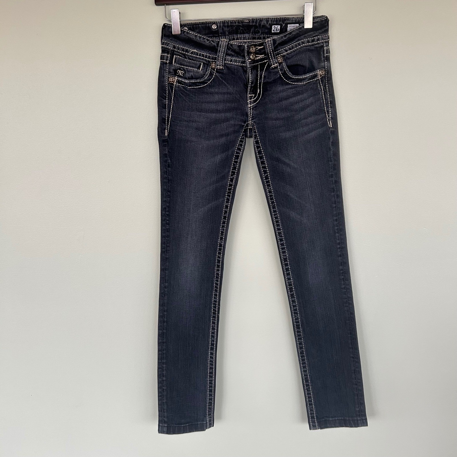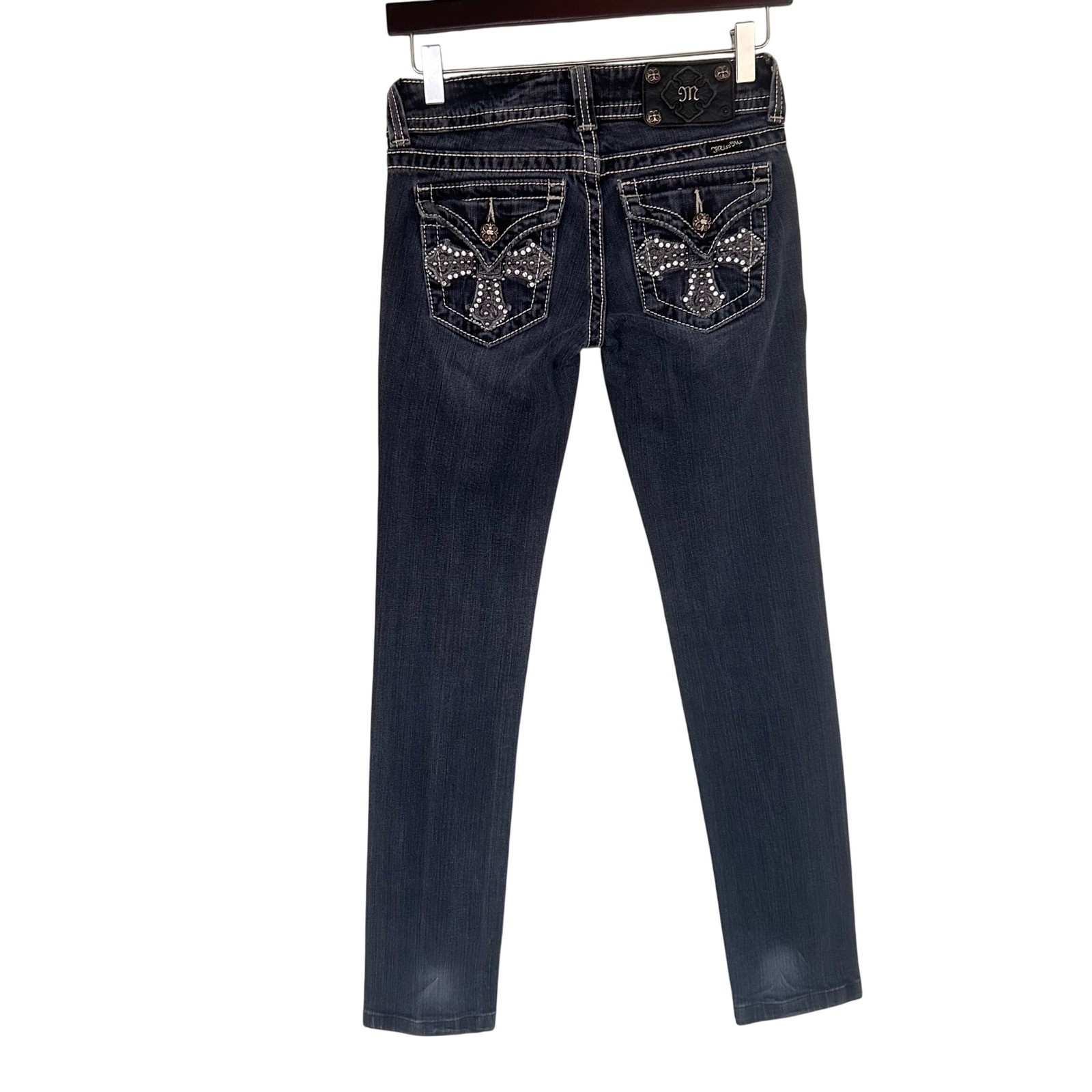 Miss Me Jeans JP5046SKX skinny fit in a dark wash. Detailed with contrasting white stitching throughout and distinctive embellished back pockets featuring a cross design with rhinestones and pearls. The waistband includes a black leather patch with the signature 'M' logo. Perfect for casual outings or adding a touch of flair to a night out. Style: Skinny Department: Women Fabric Wash: Dark Waist Size: 29 in Type: Jeans Accents: Embroidered, Rhinestone, Studded, Button, Logo Features: Stretch, Pockets Fit: Slim Pattern: Solid Rise: Mid (8.5-10.5 in) Fabric Type: Denim Inseam: 35 in Material: Cotton, Cotton Blend, Spandex Closure: Button, Zip Keywords: Miss Me Jeans, skinny jeans, black denim, rhinestone pockets, embroidered pockets, designer denim, western wear, country style, fashion jeans, casual wear, day to night, statement jeans, boutique style All items come from a smoke free, golden retriever dog friendly home. All of items unless NWT or Dry Clean Only are washed with Tide or according to care tag if hand wash only. We try our best to disclose any flaws with items, if we miss something please reach out and let us know. We can offer combined shipping on all our items. Please compare the items measurements to something you already own. We ship M-F within business days.