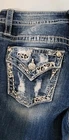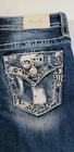 The Miss Me LA Jeans for women in size 28 feature a mid-rise bootcut design with embroidered rhinestone accents, making them a stylish and trendy choice. Made of stretch denim fabric with a mid-rise fit, these jeans offer comfort and a flattering silhouette. The contrast stitching, button closure, and zipper detail add a touch of flair to the classic denim design, perfect for any season. With their 5-pocket design and distressed pattern, these jeans are a versatile addition to any wardrobe, suitable for casual wear or dressier occasions. Made by the brand Miss Me L.A., these jeans combine fashion and function for a contemporary look.