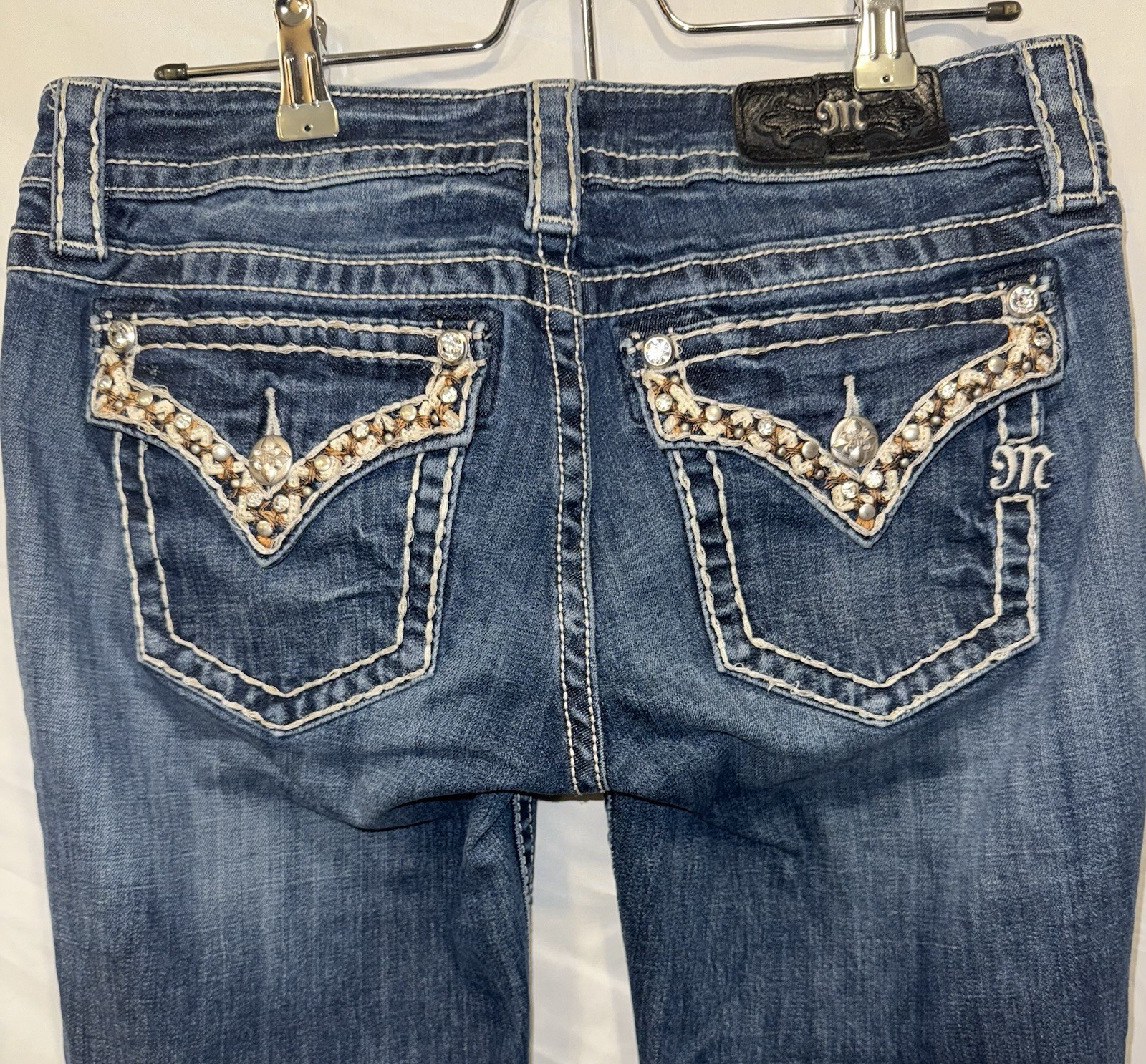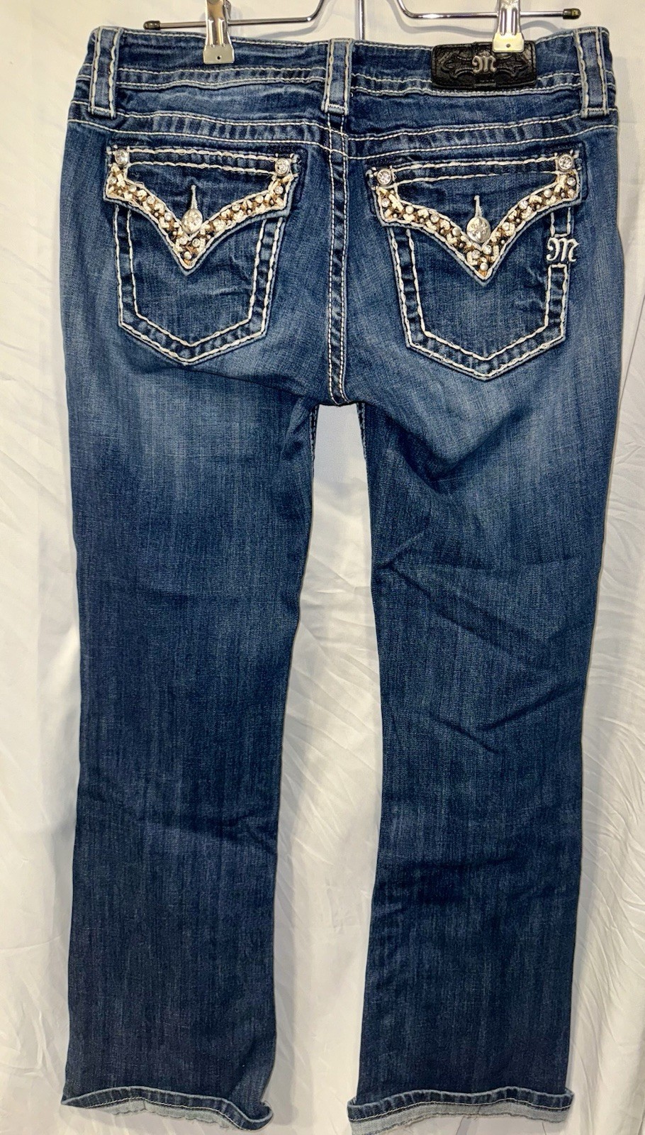 The Miss Me Women's Jeans in size 29 feature a dark wash with a bootcut style and mid-rise design. The jeans are embellished with pockets for added flair. Made from denim fabric, these jeans are a stylish choice for women looking for a versatile and trendy addition to their wardrobe.