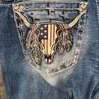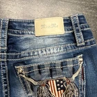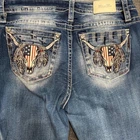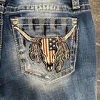 Miss Me women's bootcut jeans in a size 32. These denim pants feature a distressed blue wash with white stitching details and decorative rips on the front. The back pockets are adorned with an embroidered American flag skull design with feathers and rhinestone accents. The jeans have a button and zip fly closure and a traditional five-pocket design. The hemline is frayed. Style: Bootcut Department: Women Fabric Wash: Medium Waist Size: 32 in Type: Jeans Accents: Embroidered, Button, Logo Features: Pockets, Stretch, Distressed Fit: Classic Pattern: Paisley Rise: Mid (8.5-10.5 in) Fabric Type: Denim Material: Cotton Blend, Spandex Closure: Button Theme: Flag, Skull Keywords: Miss Me Jeans, Womens Denim, Bootcut Denim, Embellished Pockets, American Flag, Skull Design, Distressed Jeans, Rhinestone Accents, Designer Jeans, Western Style, Cowgirl Style, Statement Jeans
