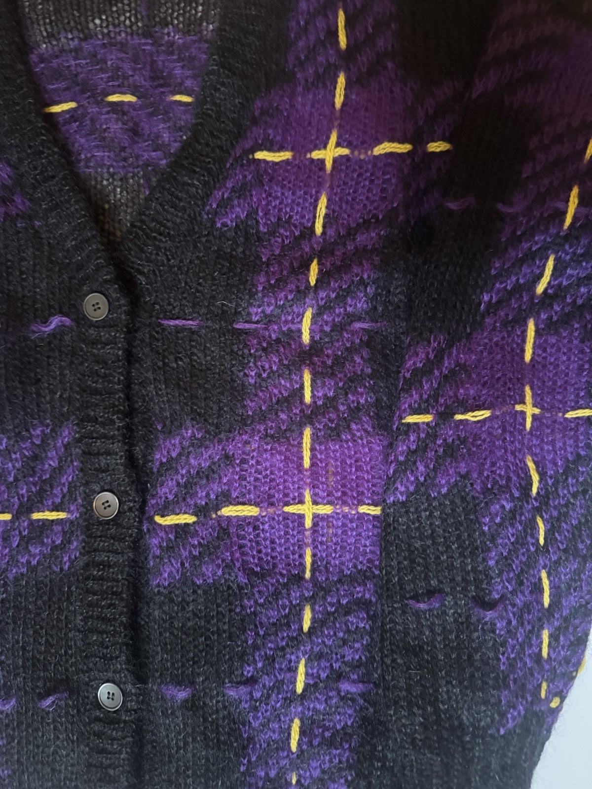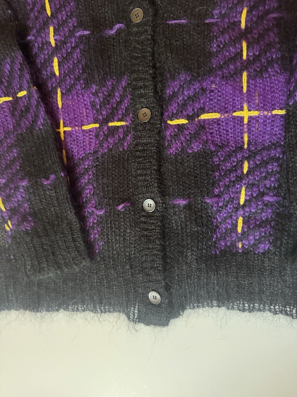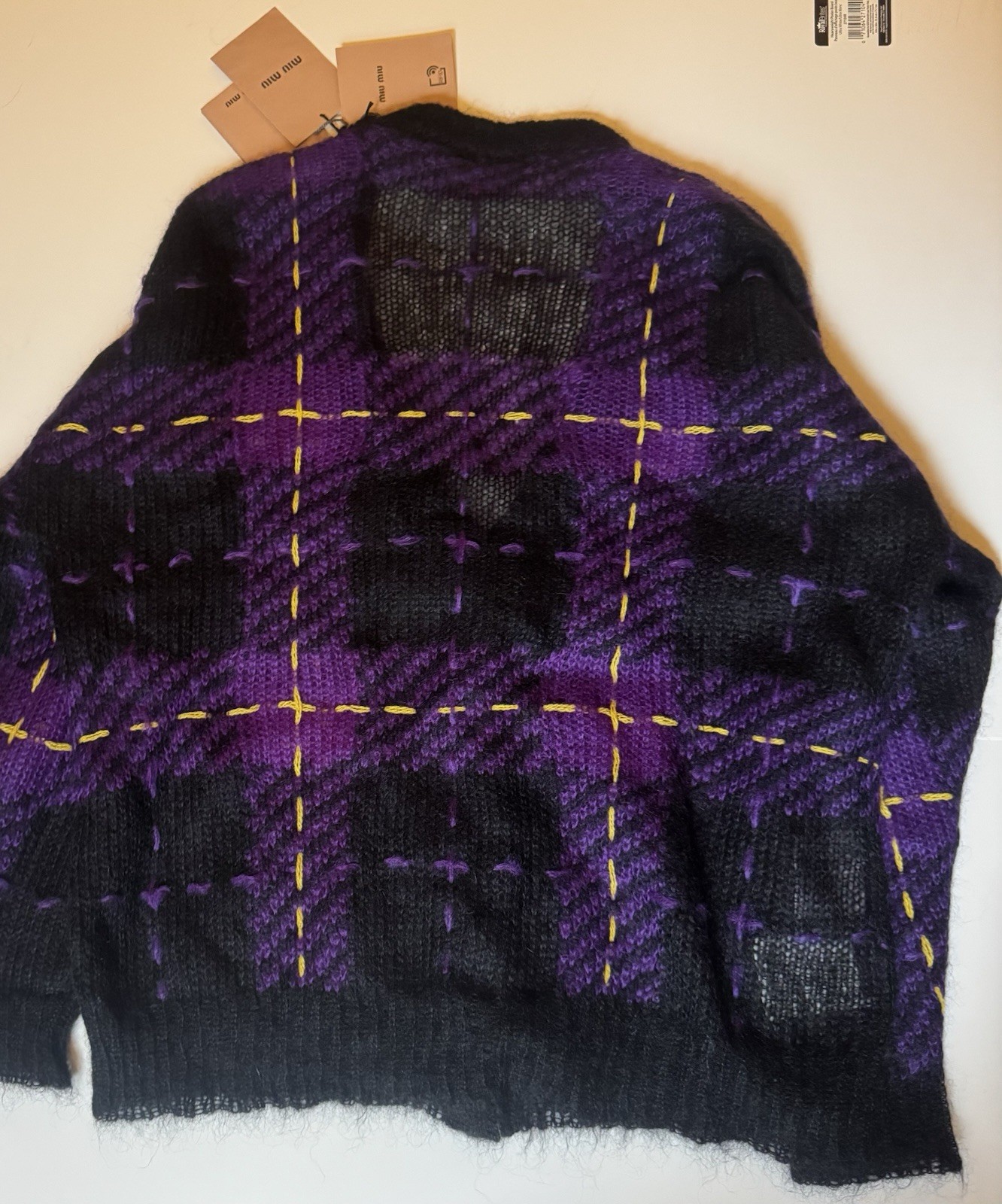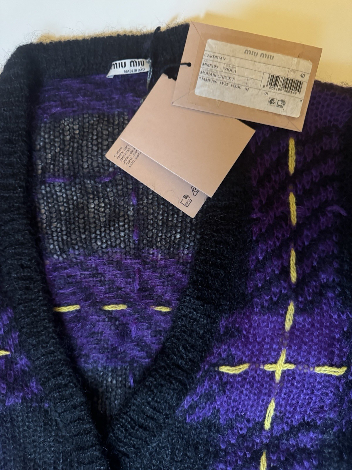 The Miu Miu Cardigan in purple viola check plaid is a stylish and versatile piece perfect for casual occasions. Made from luxurious mohair, this long sleeve cardigan in size 40 features the iconic argyle pattern that adds a touch of sophistication to any outfit. The brand's reputation for high-quality craftsmanship and design is evident in this new with tags cardigan, making it a must-have for the fall season.
