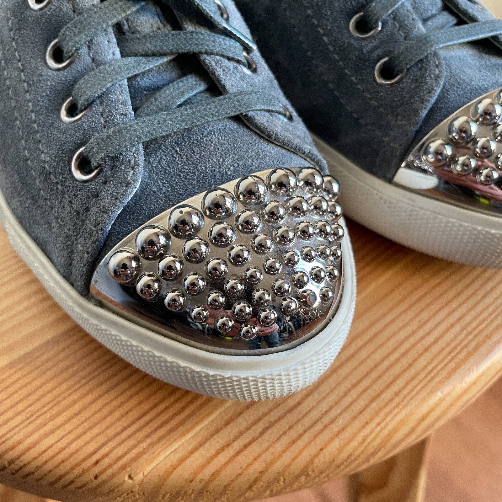 Miu Miu Grey Suede Studded Cap Toe Womens Sneakers Good pre-owned condition, has minor stains on the sole. WITHOUT BOX Size EUR 37.5 Insole lenght 24.5 cm/ 9.6 in Outsole lenght 25.5 cm/ 10 in