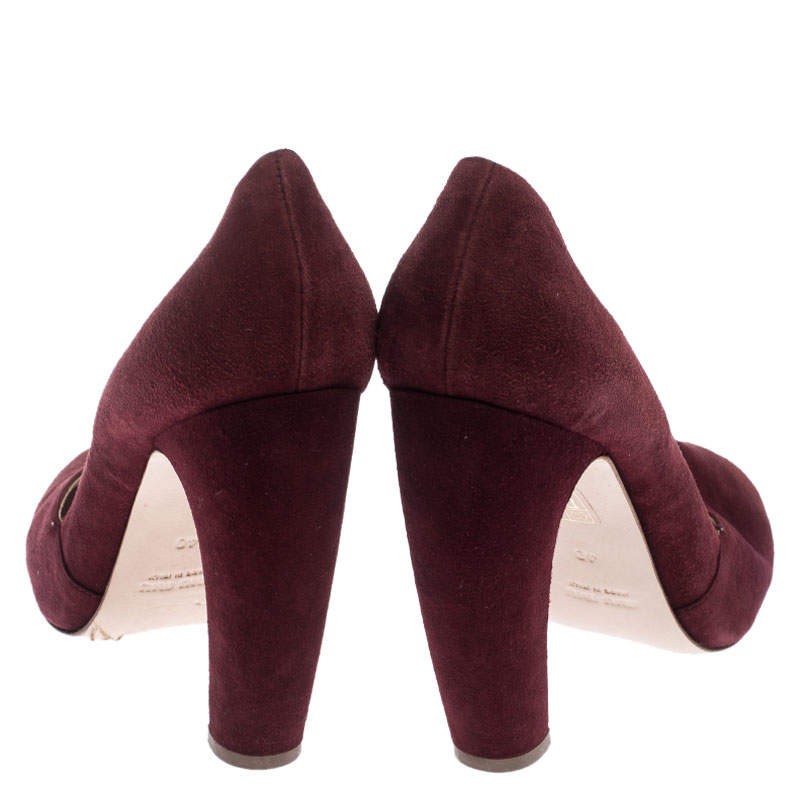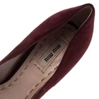 Our eBay Store About Us Contact Us Add to Favorite Sellers Miu Miu Maroon Suede Curved Heel Pumps Size 40 These pumps from the house of Miu Miu is a closet essential. They are crafted from suede and come in a lovely shade of maroon. They feature a unique heel that is curved and absolutely stunning. These pumps have round toes, are lined with leather and have an air of playfulness. Product Details Brand Miu Miu Color Burgundy Includes The Luxury Closet Packaging Size EU 40 (US 9.5/UK 7), 40 Outsole Length 23.5 cm Outsole Width 8 cm Certified by The Luxury Closet This item has gone through a detailed authentication process overseen by our experts. We offer a lifetime guarantee of authenticity on all our items. How We Check The in-house team of experts at The Luxury Closet is highly trained to verify the authenticity and the condition of the luxury products. They ensure that only 100% authentic items are put on sale.The evaluation process is unique with its own mix of assessment criteria and differs according to the category. Each item is evaluated based on the following combination of hallmarks, hardware, stitching, symmetry, material, craftsmanship, stamping, codes, hologram stickers, and packaging. Our authenticators also check if the items have been modified or amended (e.g., aftermarket diamonds, replaced batteries, repaired bags, etc.) International Buyers Import duties, taxes and charges are not included in the item price. These charges are the buyers responsibility. Please check with your country’s customs office to determine what these additional cost will be prior to buying.