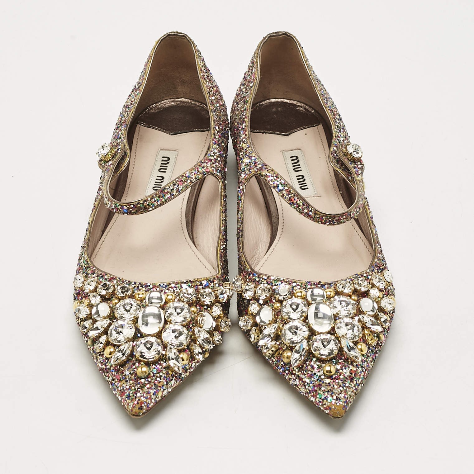 Our eBay Store About Us Contact Us Add to Favorite Sellers Miu Miu Multicolor Glitter Mary Jane Crystals Ballet Flats Size 375 These Mary Janes by Miu Miu sparkle with multicolor glitter and a crystal-embellished toe. The thin strap and low heel ground the playful finish in comfort. Product Details Brand Miu Miu Color Multicolor Includes The Luxury Closet Packaging Outsole Length 27.5 cm Outsole Width 8 cm Size 37.5 Certified by The Luxury Closet This item has gone through a detailed authentication process overseen by our experts. We offer a lifetime guarantee of authenticity on all our items. How We Check The in-house team of experts at The Luxury Closet is highly trained to verify the authenticity and the condition of the luxury products. They ensure that only 100% authentic items are put on sale.The evaluation process is unique with its own mix of assessment criteria and differs according to the category. Each item is evaluated based on the following combination of hallmarks, hardware, stitching, symmetry, material, craftsmanship, stamping, codes, hologram stickers, and packaging. Our authenticators also check if the items have been modified or amended (e.g., aftermarket diamonds, replaced batteries, repaired bags, etc.) International Buyers Import duties, taxes and charges are not included in the item price. These charges are the buyers responsibility. Please check with your country’s customs office to determine what these additional cost will be prior to buying.