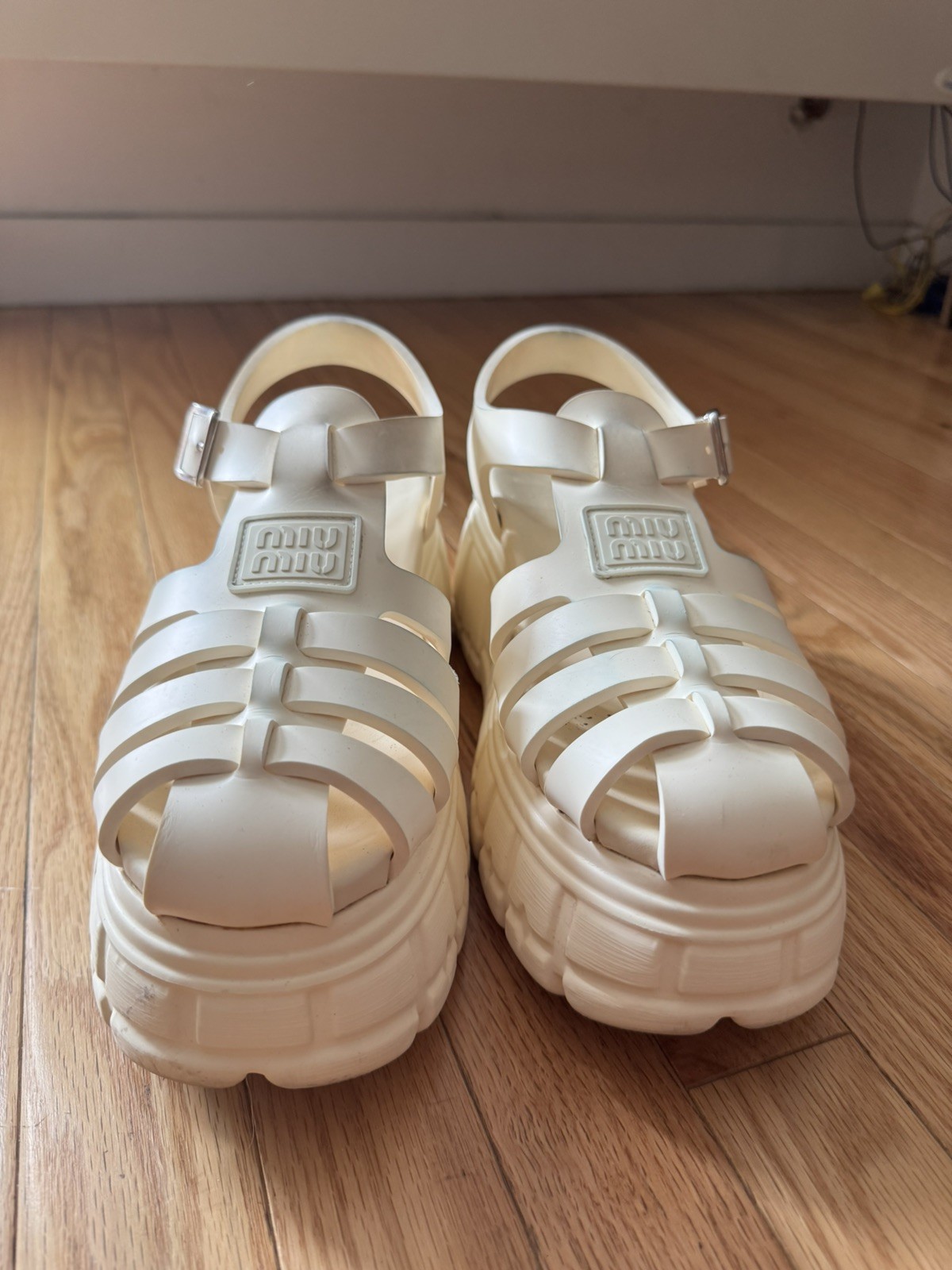 Great condition, no box These Miu Miu Size 40 Platform Sandals in black are a stylish and trendy choice for any fashion-forward lady. With a high heel and platform design, these sandals offer both comfort and style. Made in Italy with the highest quality materials, these sandals feature a T-strap closure and an EVA outsole and lining material. The sleek and modern design, along with the renowned Miu Miu brand, make these sandals a must-have for any summer wardrobe. Upgrade your shoe collection with these chic sandals that are sure to turn heads.