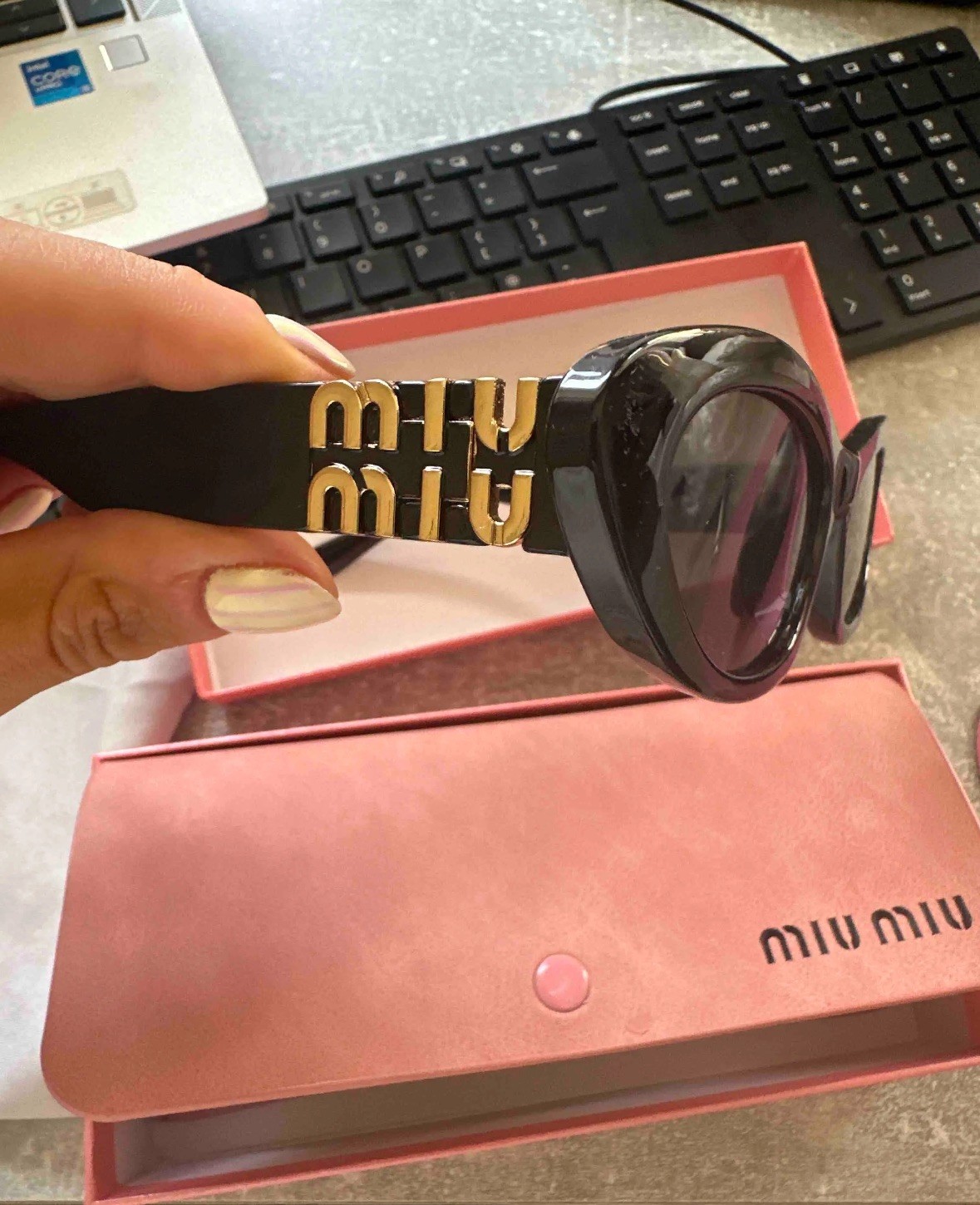The Miu Miu Sunglasses in Black Gold Dark are a stylish and luxurious accessory for women. Featuring a solid black frame with gold accents, these designer sunglasses have tinted lenses with a classic rectangle style. Made in Italy with high-quality plastic materials, they offer UV400 protection and are lightweight for comfortable wear. The Miu Miu brand adds a touch of sophistication and elegance to any outfit, making them a must-have for any fashionable woman.