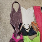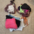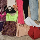 Mixed Clothing Lot Athletic Wear Jeans Denim Tops Bundle Size Small 15 Pieces All in great condition, some like new, only flaw is pants at seam as shown in last photo, could be fixed/worn distressed items are: simply styled henley thermal, Aerie Henley thermal, Eddie Bauer button up plaid, mossimo purple v-neck, princess Polly green scrunch front shirt top size 4, Lululemon pink oxygen sports bra size 4, hoaka swim bikini top size large but fits like small/medium, Urban Outfitters pink sparkle bodysuit, Free people bodysuit, Urban Outfitters pink pattern pants, black puma leggings, Lucky Brand pajama pants, a new day barrel jeans size 2, PacSun bootcut jeans size 27, brand new headband Diverse clothing bundle featuring athletic tops, casual wear, and denim. Includes sports bras, tank tops, long sleeve shirts, and jeans. Mix of solid and plaid patterns.