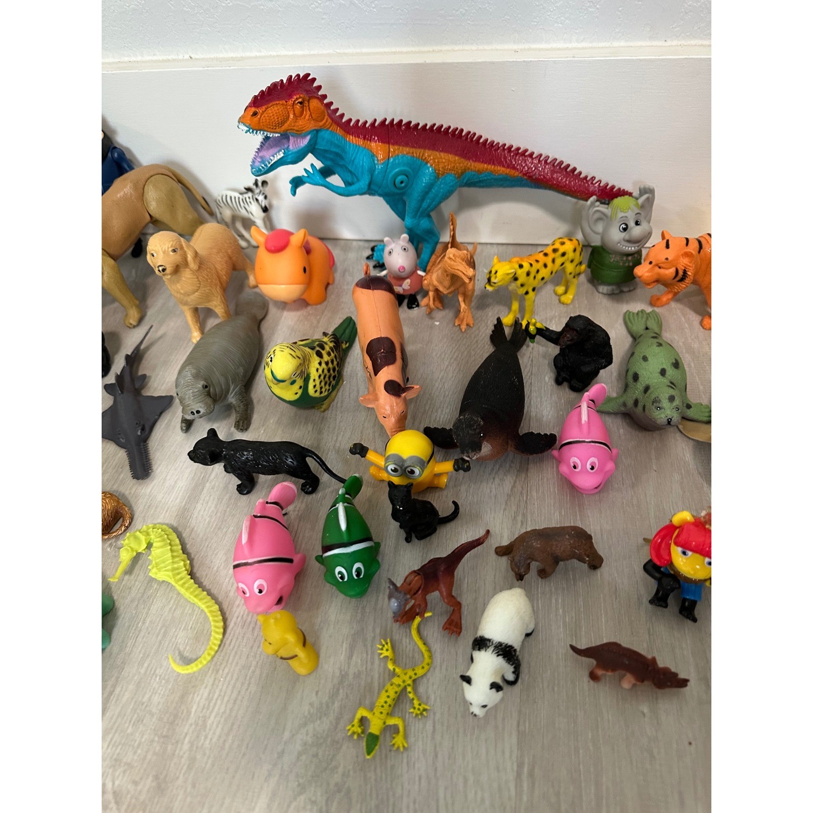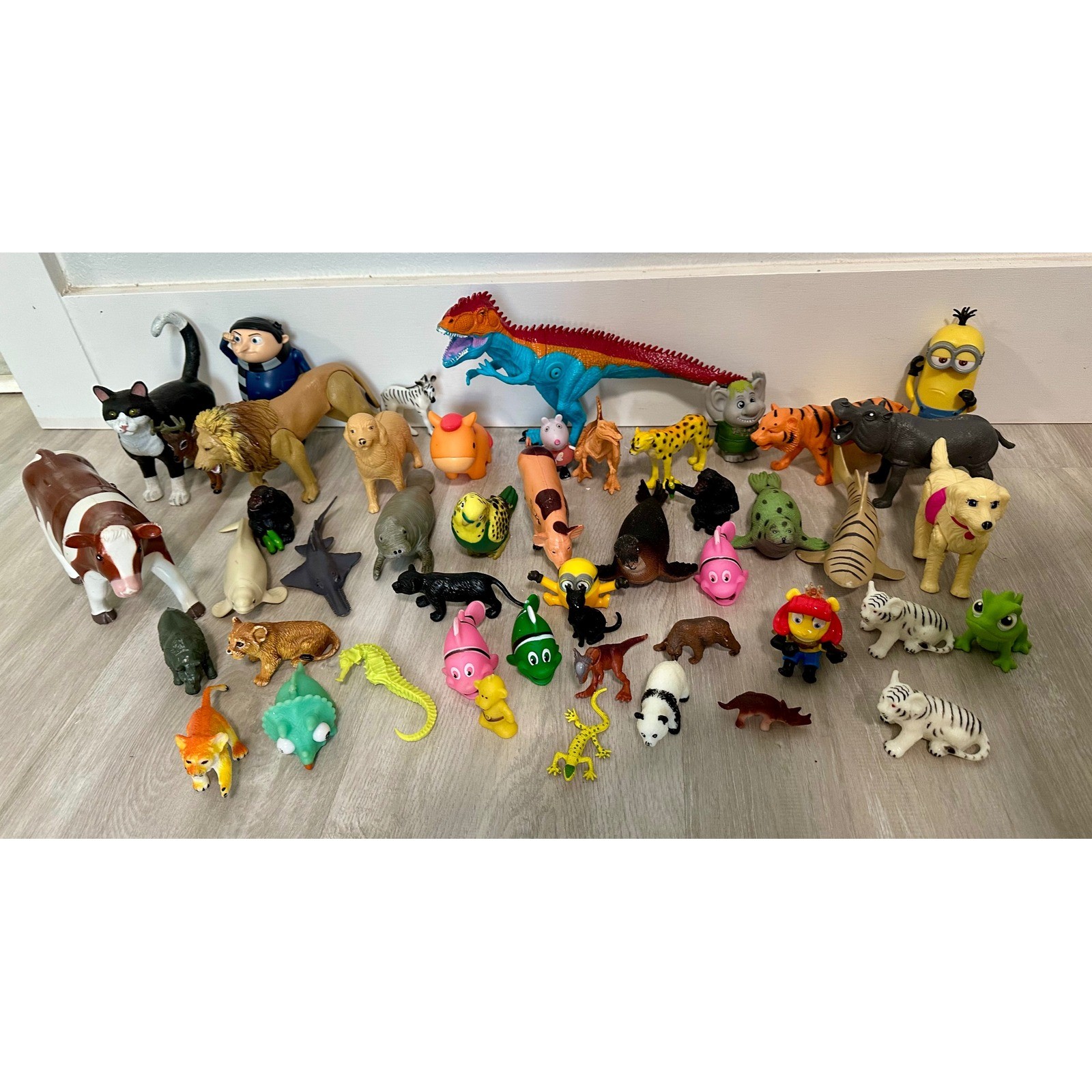 Unleash a wild kingdom of imagination with this diverse collection of over 40 plastic toy figures! This vibrant assortment features a delightful mix of animals, from majestic lions and playful cats to prehistoric dinosaurs and mysterious sea creatures. A pair of mischievous Minions add a pop of fun to the menagerie. Perfect for sparking creativity during playtime, creating captivating dioramas, or adding a whimsical touch to party decorations, this collection promises hours of engaging fun for kids of all ages. Character: Minion, Gr, Gru Franchise: Disney, Despicable Me Type: Mixed Lot Material: Plastic, ABS Plastic, Hard Plastic, Vinyl Plastic Age Level: 3-4 Years Theme: Animals & Dinosaurs Original/Licensed Reproduction: Licensed Reproduction Keywords: toy animals, plastic figures, dinosaur toys, animal figurines, kids toys, toy collection, minions, sea creatures, pretend play, diorama, party favors, animal kingdom, bulk toys, mixed lot