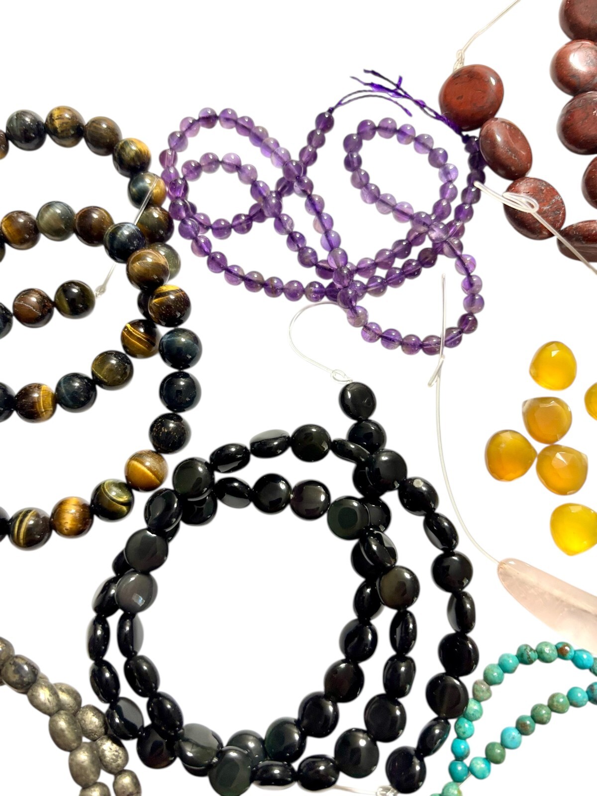 This product is a mixed lot of semi-precious gemstone beads, featuring a variety of vibrant colors. These beads, sourced from unused stock, offer a wide range of options for jewelry making. Suitable for creating unique and beautiful pieces of jewelry, this lot provides a versatile collection of gemstone beads for any creative project. Included in this lot are: Tigers eye Red Jasper Strand of mixed gemstone beads Rose Quartz Rainbow Obsidian Turquoise Amethyst Black Agate Chalcedony Pyrite