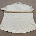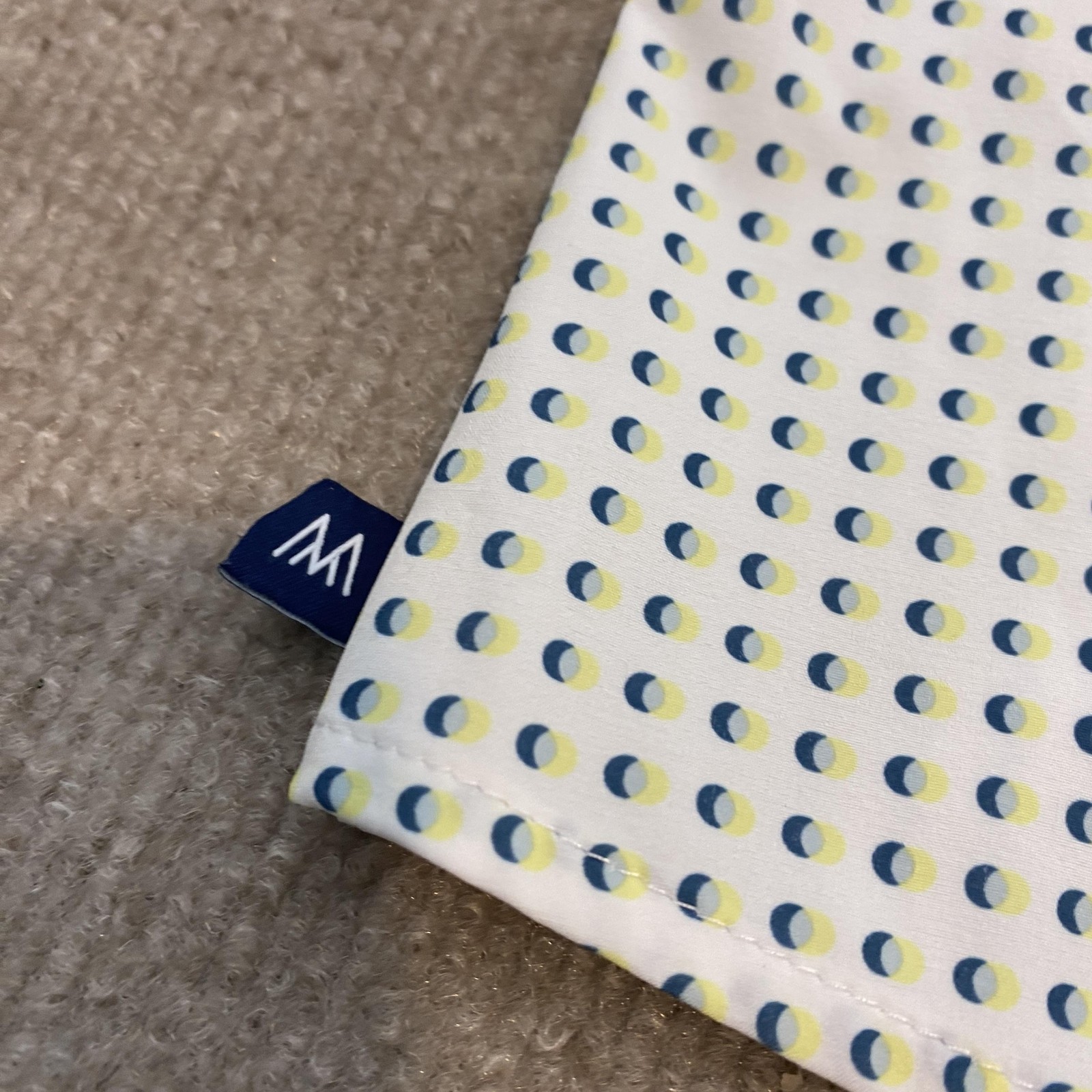 Pre-owned Mizzen+Main Leeward short sleeve performance shirt with light wear from prior use. Fabric is clean and intact with no holes, snags, or stains, and all buttons and seams are secure throughout. Shirt shows light wrinkling from storage and is sold without the original tags, packaging, or additional accessories. Brand: Mizzen+Main. Style: Mens Mizzen+Main Leeward short sleeve button-up shirt with a trim modern fit silhouette. Color: White base with small blue and light yellow geometric polka dot print and light blue floral micro-dot trim inside the collar and sleeve cuffs. Size: Mens 2XL (XXL Trim) as printed on the interior neck label. Material: Smooth woven polyester and spandex performance fabric with a lightweight, stretchy hand feel. Design details: Spread collar, full front button closure with matching white buttons, short sleeves with contrast printed inner cuffs, curved shirttail hem, and clean front styling. Features: Wrinkle-resistant stretch fabric designed for comfort and ease of movement, moisture-wicking and quick-drying properties for warm weather wear, and lightweight construction suitable for travel and everyday use. Branding and identifiers: MIZZEN+MAIN wordmark label and Leeward line tag at the inner collar, small woven M logo flag at the side seam, interior care label with spare buttons attached, RN 157281, and tag stating made in Indonesia. Season and occasion: Ideal for summer and warm-weather casual wear, business-casual outfits, travel, and social events. Special notes: Mens white Mizzen+Main Leeward trim fit short sleeve performance button-up shirt in size 2XL.