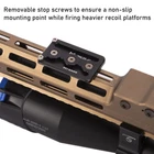 M-LOK Arca Adapter - 2 Slot for ARCA/RRS Interface is a lightweight, machined, mil-spec hard anodized aluminum mounting plate that is designed for M-LOK slot compatible hand guards and is fully compatible with tripods that use the ARCA/RRS standard. It has comfortable, yet functional, snag-resistant beveled edges. The 2 Slot M-LOK adapter features close-end rail that are optimally located to limit overall travel of accessories ensures securely in place throughout the most rugged use and heaviest recoil impulses, making the this adapter a rugged, repeatable and precise mounting solution. C OMPATIBILITY M-LOK forends and hand guards Accessories using the Arca-Swiss Standard Accessories using the RRS Dovetail Standard Specs Length: 2.36"/ 60mm Width: 1.5"/ 38mm Thickness: 0.4"/10mm Weight: 1.17 oz/ 33g 【 All Metal Sturdy Construction】: Precision machined from solid blocks of 7075 aluminum without excess weight, long time hard anodized treatment for higher durability, screws and anti-slip lugs are stainless steel 【Compatible with RRS and Arca Type Dovetail】: The semi permanent plate with 1.5" dovetail, fully compatible with Arca Swiss QR plates and RRS standard dovetail quick release clamps, as well as various tripod ball heads. Quick mounting for hunting 【Fully compatible with M LOK system】: It can be mounted on the rail from the top and stabilized at 3 T nut points. Mounts directly to an M LOK compatible system to reduce recoil shock and lug relief. Also comes with functional anti jam beveled edges 【Removable Stop Screws】: The 2 removable stop screws on the end ensure a reliable hunting experience and reduce the risk of falling, even when launching a heavier recoil platform 【Lightweight Hollowed Out Design】: Weighing only 1.17 oz/ 33g, Max Length: 2.36in/6cm, won't add extra weight to your hunting