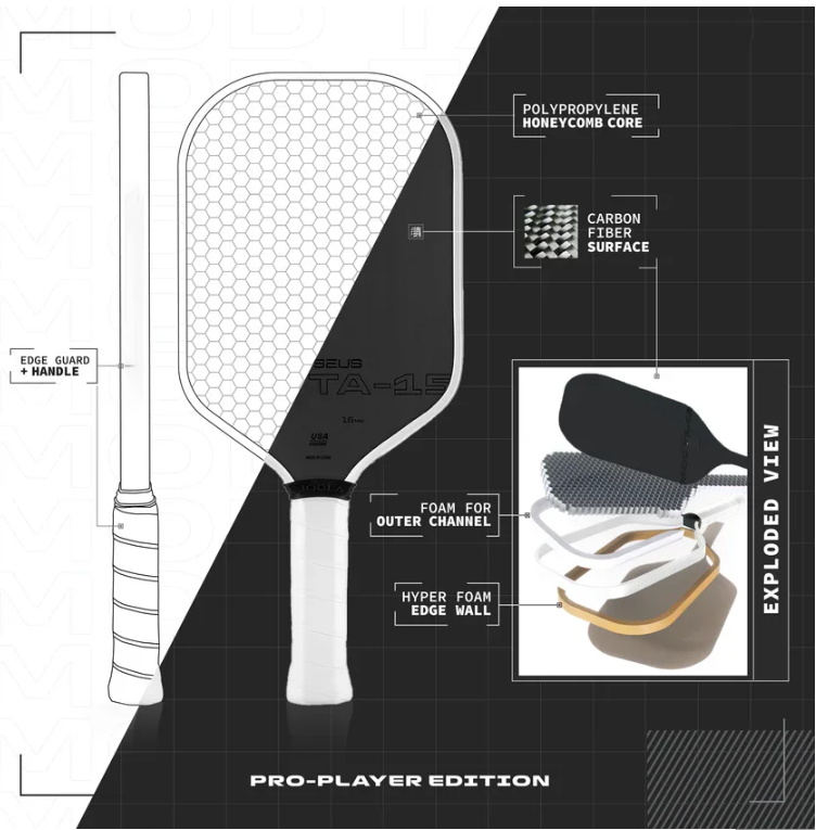 Model Number MOD TA-15 Pro Material Carbon Fiber, Toray carbon Fiber Age Group Children, Adults Usage Pickelball Paddle Paddle Length (cm) 41.8 Handle Length(cm) 14 Weight (g) 225g+/-5g Product Name MOD TA-15 16mm Material Toray Carbon Fiber Color White Core Material 8mm PP Polypropylene Honeycomb Core with EVA Foam 16mm Core Face Material Vertical carbon fiber+horizontal glass fiber+vertical carbon fiber Size 16.5*7.5 inch RZ/RT Value Close 30/40