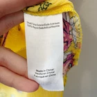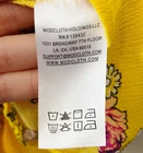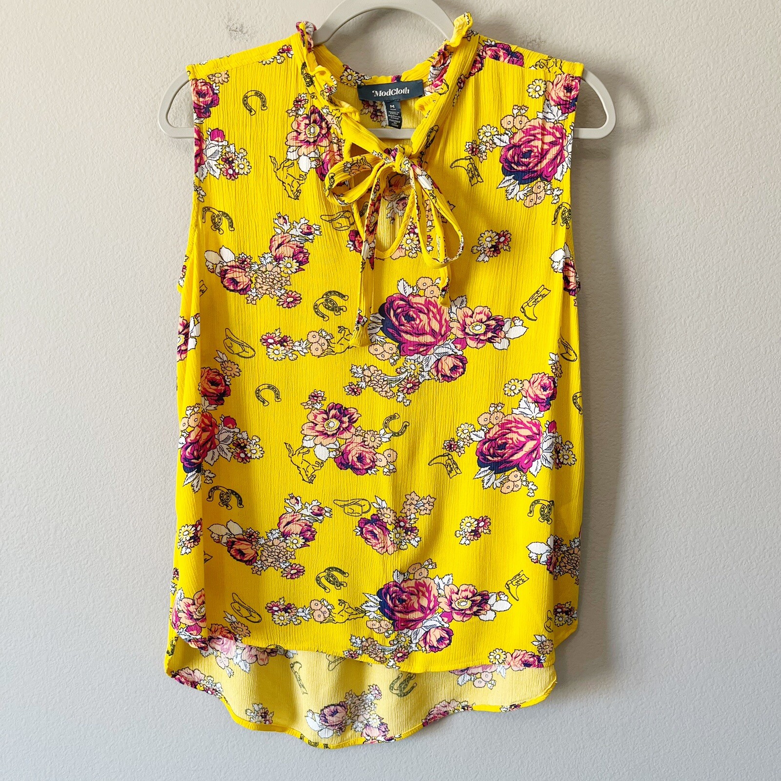 ModCloth Like the Wind Tie-Neck Blouse in mustard yellow with pink floral print. Print also has a western theme with horse shoes, boots, horses, and hats. Size medium. Ruffles at neckline. Curved hemline with side slits. Pre-owned, excellent used condition. All measurements are approximate, not exact. Length: 21-28” Pit to pit: 19.5” measured flat