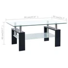 Add a flair of modern charm into your existing interior with this simple yet stylish coffee table! This end table has a tempered glass top. It is also supported by melamine legs, making it exceedingly safe and stable. Thanks to its 2-layer design, this couch table provides you with extra storage room and also contributes to its sturdy construction! Additionally, the side table is easy to clean with a damp cloth. Color: Black and transparent Material: Tempered glass, melamine Dimensions: 37.4" x 21.7" x 15.7" (L x W x H) Upper table top thickness: 0.2" Lower table top thickness: 0.2" Features 2 layers Assembly required: Yes California Proposition 65 Warning: This product can expose you to chemicals including wood dust, which is known to the State of California to cause cancer. For more information go to . Shipping Restrictions Due to the limited access of our couriers, this item cannot be delivered to the following locations: Alaska Federated States of Micronesia Guam Hawaii Marshall Islands Military Posts (APO / FPO) Palau Puerto Rico US PO BOX Virgin Islands Our customer support will contact buyers for orders with no shipment service, and these orders will be cancelled and fully refunded afterwards.