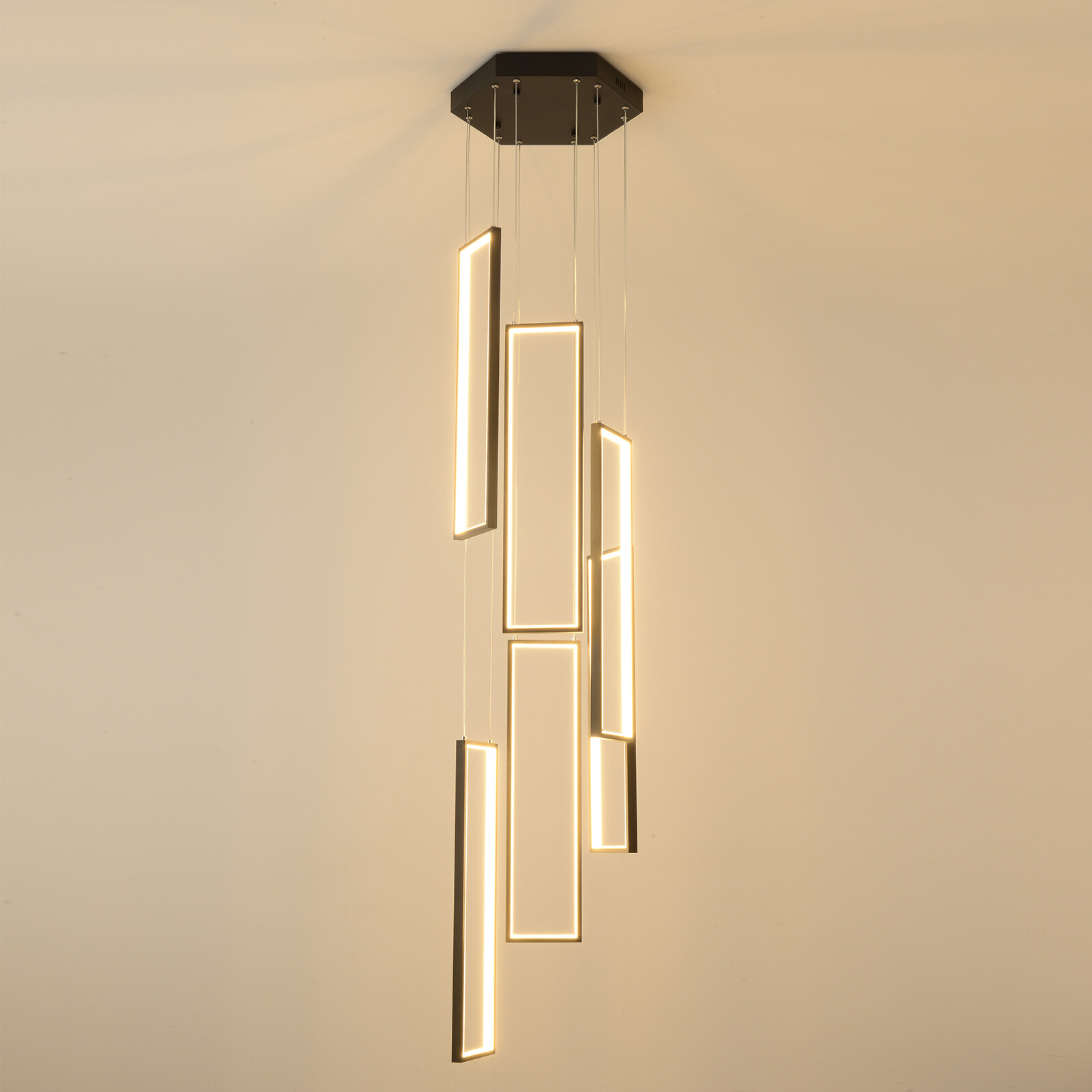 Details Round Base: The large round base(15.7*2inch) increases stress area, and can make the item fixed firm without falling easily. Clear Circuit: The separation of power cord and steel wire not only prevents wire entanglement but also makes it more aesthetically pleasing. Application With a suitable area of 61.46-322.92ft² and a floor height of 9.84-13.12ft is very suitable for residential and commercial lighting, living rooms, restaurants, entrances, attics, villas, wedding halls, foyers, banquet corridors, kitchens, hotel lobbies, and will become the focal point of your home. In addition, it is also suitable for installation on sloping circular and arched ceilings. Package Included 1* 6 Rectangle LED Chandelier 1* Remote Control 1* English Instruction All Accessories for Assembly Modern Chandelier Pendant Lamp Raindrop LED Living Room Ceiling Light 6 LED Modern Led Chandelier Lighting, Dimmable with Remote Control 10 Rings Black Pendant Light Adjustable Height Hanging Ceiling Light Fixture,for Staircase Foyer High Ceiling Living Room Description Bright light can bring charm and warmth to your room, and light up your life. Made of premium aluminum and silica gel, this 6 rectangle LED chandelier is strong and durable. It can create bright light to brighten your life and will be a great addition to your house. Key Features Long Service Life: The aluminum and silica gel have high strength, good toughness, and good formability and the high-temperature baking paint process make it waterproof, rust-proof, and corrosion-resistant, so you can use it for a long time without frequent replacement. Safety Guard: The multiple heat dissipation holes on the base and wide voltage (95-260V) design can effectively ensure safety and extend product life, so you can use it with confidence. Excellent Light Source: The environment-friendly and energy-saving LED light with high color index can effectively avoid glare and stroboscopic, protect your eyes, restore the most authentic color of objects, serve an area of 161.46-322.92ft², and save your costs. Carefully Designed: The infinitely adjustable brightness and three types of lighting (warm, natural, and cold) fully meet your usage needs in different scenarios, making it more convenient. Embrace Smart Life: Applied with remote control, you can easily adjust the light colors while lying in bed and don't need to get up and press the switch, bringing more convenience to your life. Adjustable Design: You can easily adjust the hanging wire of the 6 rectangle, which can be adjusted from 0-6.65ft to adapt to different ceiling heights, meet your different needs, and create your own unique lighting. In addition, you can also freely adjust 6 rectangle through the cable locking pin to obtain different shapes and make your fixture decoration never outdated. Stylish Appearance: The atmospheric and stable black color paired with different sizes of circles makes it fashionable and minimalist, perfectly integrating different home decoration styles, enhancing taste, and becoming an eye-catching decoration.6 Rectangle drop down from the ceiling plate, just like bubbles, adding some elegant and stylish. Excellent Gift: The beautiful appearance and good practicality make it a great gift for parents, friends, and lovers on birthdays and holidays. Easy Clean-up: The simple structure and smooth surface provided by high-quality materials and craftsmanship let you easily wipe it clean with a towel When dust accumulates. Protective Packaging: The foam can effectively reduce the impact and ensure that this item is fully delivered to you to the greatest extent. Guaranteed Customer Service: We aim to provide quality products and services. If you have problems, please feel free to contact us. We will reply and solve the problem for you as soon as possible. Details Round Base: The large round base(15.7*2inch) increases stress area, and can make the item fixed firm without falling easily. Clear Circuit: The separation of power cord and steel wire not only prevents wire entanglement but also makes it more aesthetically pleasing. Application With a suitable area of 61.46-322.92ft² and a floor height of 9.84-13.12ft is very suitable for residential and commercial lighting, living rooms, restaurants, entrances, attics, villas, wedding halls, foyers, banquet corridors, stairs, kitchens, restaurants, hotel lobbies, and will become the focal point of your home. In addition, it is also suitable for installation on sloping circular and arched ceilings. Specification Color: Black Material: Aluminium, Silica Gel, Steel Style: Modern Light Fixture Form: Chandelier Specific Uses For Product: Indoor Use Only Current: DC Control Method: Remote Battery Type: 2*AAA Batteries(Not Included) Light Source Type: LED Brightness: Infinitely Adjustable Light Color: Cool Light, Neutral Light, Warm light Surface Treatment: High-temperature Baking Paint Shape: Rectangle Lighting Method: Adjustable Assembly Required: Yes Switch Installation Type: Ceiling Mount Color Temperature Range: 3000K-6500K Voltage: AC 95-260 Volts Number of Rings: 6 Number of Items: 1 Efficiency: E Wattage: 90W Luminous Flux: 90lumen Base Size(D*H): 40*5cm/15.7*2in Adjustable Height Range: 0-2m/0-6.65ft Suitable Floor Height: 3-4m/9.84-13.12ft Applicable Area: About 15-30m²/161.46-322.92ft² Height(Max): 78.7'' Rectangle Diameter: 60cm/23.6in Package Included 1* 6 Rectangle LED Chandelier 1* Remote Control 1* English Instruction All Accessories for Assembly Notes The battery in the remote control is not equipped. Please prepare two AAA batteries yourself. Please check the dimensions of the product before ordering to ensure it fits your home. Please ensure that all screws are tightened into the ceiling. For a safe and secure installation, please ensure that the electrical box is firmly mounted and properly attached to a structural part of the building. Please make sure that all wires are connected. When unpacking, be careful not to pull wit