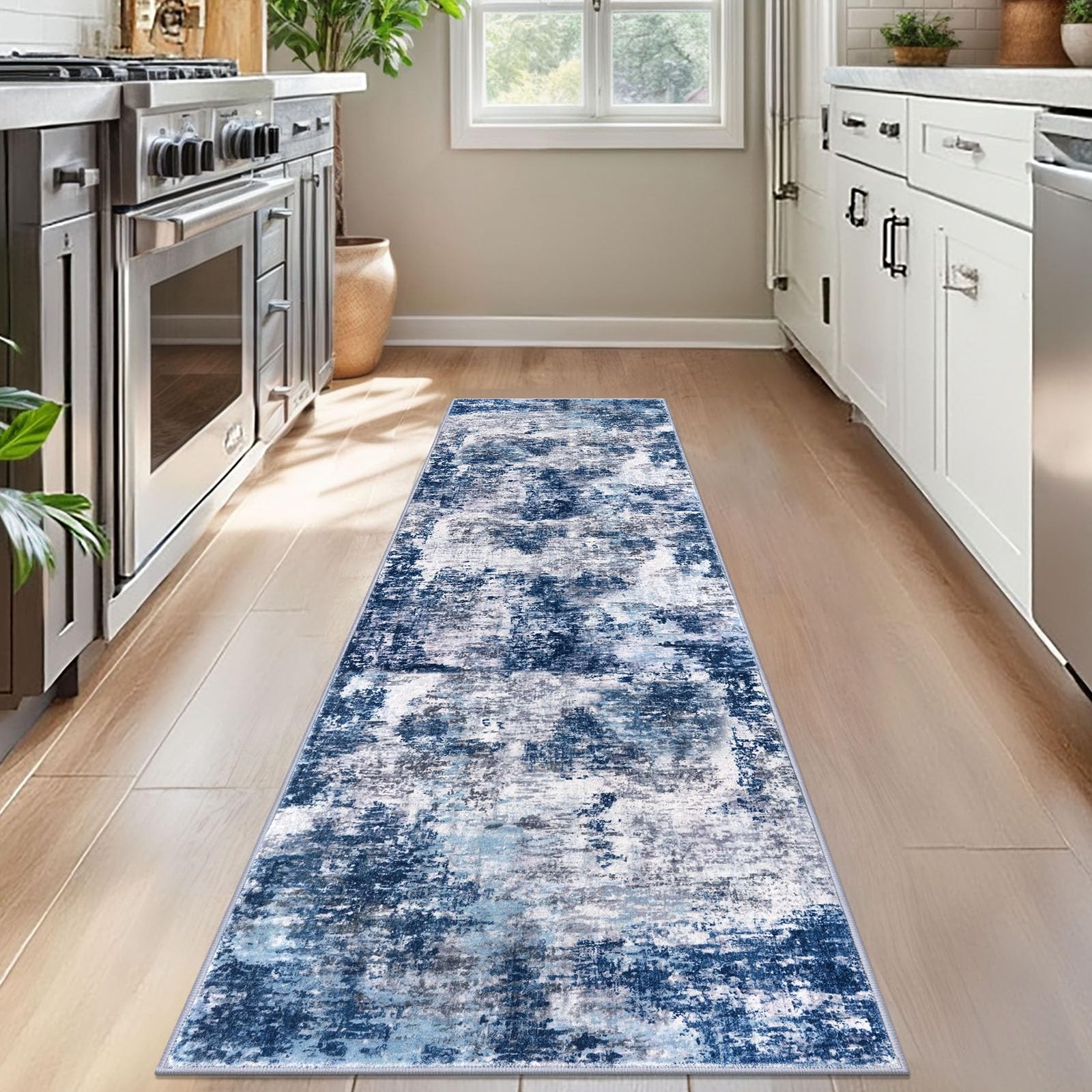 This kitchen mat adds a to any room. Perfect as a bedside rug, bedroom rug, kitchen rug, or living room rug, its versatile style blends seamlessly with any interior design. The hallway runner rug features a captivating Modern Ombre pattern, which brings a vintage charm to your space. Non-Slip This washable rug runner is designed to be non-slip, ensuring it stays in place on hardwood floors. The front door rug is also washable, making it a practical choice for high-traffic areas. Versatile This entryway rug is not just for indoors, but it can also be used as a small outdoor rug, perfect for your patio or balcony. Note on Appearance: Due to shipping folds, the rug may have temporary wrinkles. Don't fret, it'll regain its shape soon. For a quicker fix, roll it in reverse,place it upside down, or use weights to press it flat. Alternatively, a quick iron on a low setting will do the trick. Care Instructions: For longevity, wash on a delicate cycle using a mild detergent. Note: Like most dark cotton items, it may shrink up to an inch. Air dry to prevent added shrinkage. If needed, gently stretch or iron on low to restore its form. Key Reminder: To smooth out creases, first add a wet towel on the back and iron on a low heat setting; Next, reverse fold and roll it for up to a week; Then, place weights evenly if needed; Finally, lay it flat in an open space; Note: Slight color variations may occur under different lighting Rug Specs: Size: 2x7 Feet (24x84 Inches); Thickness: 0.32 inch; Color: Gray-Beige Multi; Dominated by soft gray tones, complemented by subtle beige accents and hints of light brown; Ideal for hallways, kitchen runners, or entryways, adding warmth and style to narrow spaces Machine Washable and Vacuuming Tips: Sweep or wipe the blue grey rug runner for daily upkeep; Use low-speed vacuuming to prevent movement or bunching; For deeper cleaning, machine wash in cold water and avoid bleach to preserve colors Non-Slip Backing: This kitchen runner rug features a TPE rubber backing that keeps it securely in place, preventing movement and protecting floors from heavy traffic Ultra-Soft and Safe: This abstract runner rug is soft, durable, and fade-resistant; The ombre print of bedside runner 2x7 blends with any decor, making it a versatile addition; Ideal for hallways, it combines luxury with practicality Kid and Pet Friendly: This washable bedroom runner rug is ideal for kids and pets; Its low-pile surface prevents pet hair buildup and is easy to clean; Durable construction resists chewing, scratching, and snags, making it a safe, practical choice for any home Foldable and Versatile: The non slip runner rug is foldable for easy storage, great for those who frequently change decor; This 7ft runner rug serves as a bedside runner, kitchen runner or entryway runner; It enhances your home's beauty while being practical