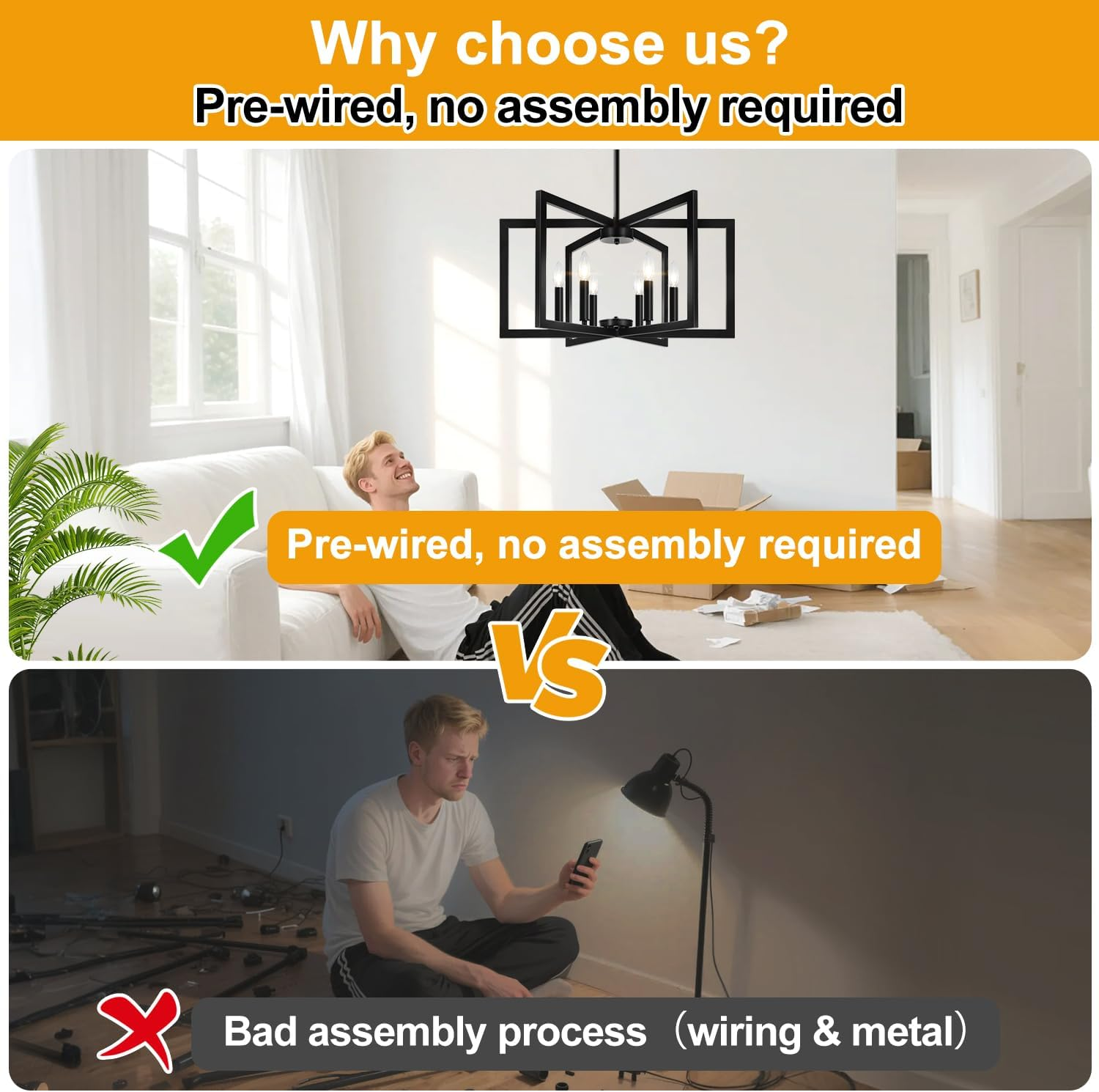【Style & Design】This modern chandelier features 6 geometric square metal frames, each with a lamp holder. The clean, minimalist design creates a modern look, and when the frames are unfolded, it resembles a blooming flower, adding a touch of elegance to any space such as the kitchen island, living room, foyer, dining table, entryway, bedroom, farmhouse, and office. 【Partially pre-assembled & Easy Installation】The lamp arms come pre-assembled—simply unfold them and connect two frames to complete the assembly of your black chandelier, assembly is a breeze! Besides, our dining room light fixture comes with all the necessary parts and detailed instructions for hassle-free installation. 【Upgraded Quality】Our chandelier for dining room is crafted with high-quality, durable materials to ensure lasting performance. The sturdy metal frame is designed to resist bending during use or transportation. Featuring an upgraded matte black finish, it adds an elegant touch while the anti-scratch and anti-rust coating ensures the chandelier retains its original beauty over time. 【Adjustable Height】This dining room chandelier features a stable splicing rod design to reduce wobbling and adjustable height from 25.2" to 61.2", fitting sloped or flat ceilings. It has 6 E12 sockets, supporting various bulbs like LED and halogen (bulbs not included). The chandelier is dimmable with compatible bulbs and a dimmer switch (switch not included). 【Impeccable Service】As a responsible seller, we provide a 36-month warranty and technical support from a professional team. If there is any problem with our farmhouse chandelier, please feel free to contact us by clicking "Contact Seller" on the page, we will provide you with a satisfactory solution within 24 hours. Product Description