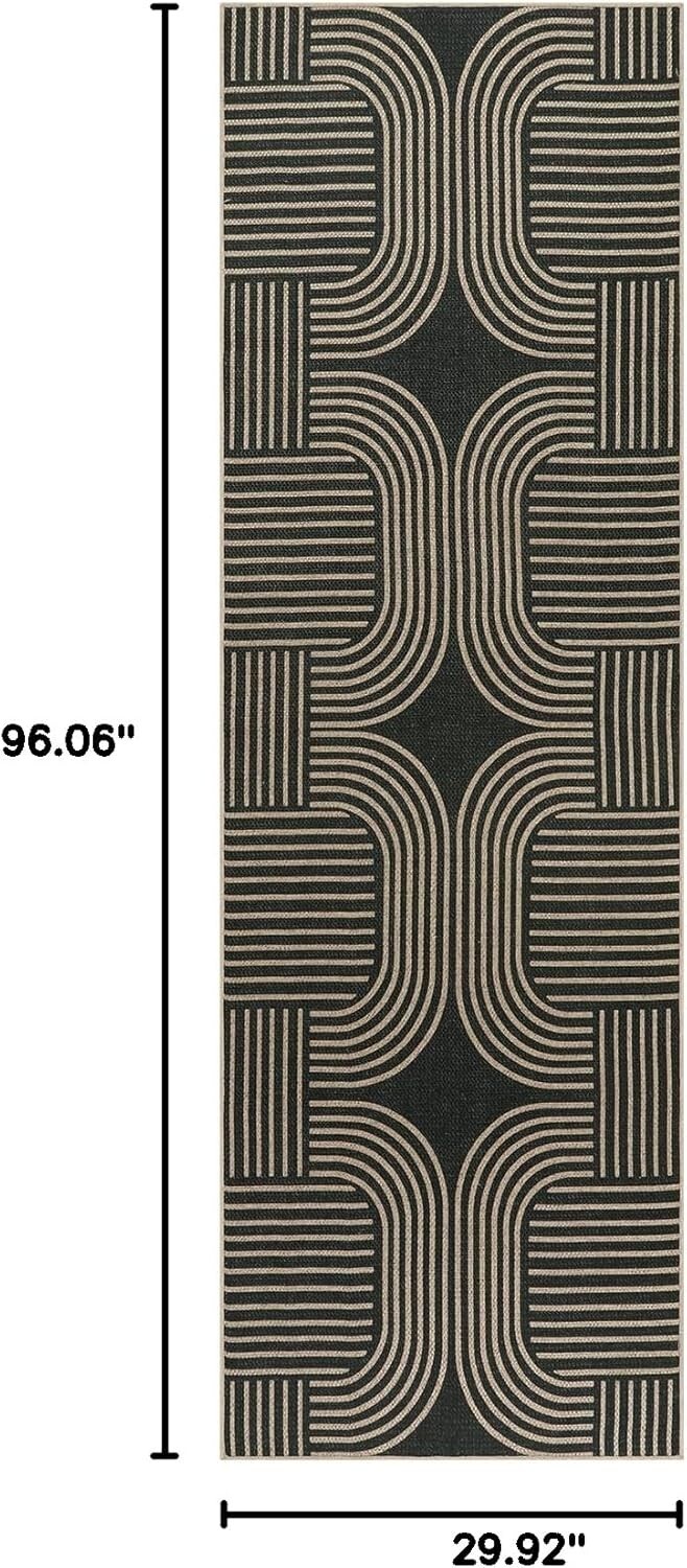 Modern Geometric Black Runner Rug, 2x8 Indoor Outdoor Hallway Kitchen Runner Rug with Rubber Backing, Farmhouse Washable Non Slip Non Shedding Floor Carpet for Bedroom Entry Patio Neutral Easy Jute Rug: Get a magic of a long lasting rug in the look of natural jute with our new Easy Jute rugs. (Not actually made from jute) Made of safe polyester that is not easy to crack, without scratching, shedding, or fraying with time Modern Geometric Rug: Its beautiful graphic design combines lines and half circles to create double geometric textures. Adding contemporary flair to any room, this rug perfectly complements a variety of spaces Non Slip and Safe Rug: Designed with TPE backing that is slip assistance, helpful to keep the carpet griping the kitchen floor, thus enhancing safety. Safe enough for family to play at home (Place on a clean and dry floor recommended) Easy to Clean: Use hose, broom or vacuum cleaner to clean dust, dirt or debris regularly. Also, can being wash in cold water on a gentle cycle, and recommend to air dry after using the washing machine Note: Our rug comes folded in a small package, which may be some creases at the beginning. We recommend that you can unroll it or place heavy books on them for a few days to hold down. Pet paws may hook into the threads of the woven rug.