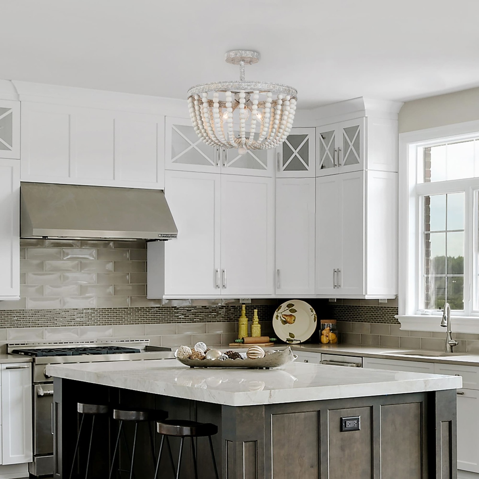 Introducing the captivating Offwhite metal frame chandelier, featuring weathered beaded accents that exude the timeless charm of vintage-inspired lighting. With its grey-white wood beads and metal accents, this light fixture emanates an ancient allure, creating a breathtaking ambiance. The three lights nestled within the light gray wooden beads cast a beautiful pattern on the wall, painting a mesmerizing picture. Perfectly suited for your living/dining room, bedroom, kitchen island, foyer, or porch, this chandelier effortlessly blends rustic elegance with a touch of vintage. Immerse yourself in the enchanting world of limited availability of unique and rustic lighting, and elevate your space with this exceptional piece that promises to leave a lasting impression.Dimension: Lamp: D16.1'' x Free Shipping Over $49.99* Details Modern Boho 3-Light Coastal Wood Beaded Semi-Flush Mount Light for Bedroom - Product Description: Introducing the captivating Offwhite metal frame chandelier, featuring weathered beaded accents that exude the timeless charm of vintage-inspired lighting. With its grey-white wood beads and metal accents, this light fixture emanates an ancient allure, creating a breathtaking ambiance. The three lights nestled within the light gray wooden beads cast a beautiful pattern on the wall, painting a mesmerizing picture. Perfectly suited for your living/dining room, bedroom, kitchen island, foyer, or porch, this chandelier effortlessly blends rustic elegance with a touch of vintage. Immerse yourself in the enchanting world of limited availability of unique and rustic lighting, and elevate your space with this exceptional piece that promises to leave a lasting impression. Dimension: LampD16.1'' x H13.4'' Round CanopyD5" x H1" MaterialMetal, Wood Beads Finish Antique Gray-white, Distressed White Wood StyleFarmhouse/ Boho/ Coastal/ Rustic/ Shabby chic Bulb3 x Type B, E12, Max 40W (BULBS NOT INCLUDE) Compatible With Dimmer Devices 2-year Limited Manufacturer Warranty UL listed for safe use