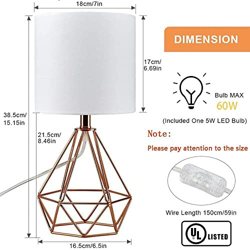 Menu 1. We require immediate payment. 2. We currently accept payment via eBay managed payments only. 3. Once payment is cleared, we will dispatch your shipment within 1-3 business days. Please refer to the "Shipping" tab for more information regarding shipping speed to your destination. Modern Table Lamp for Bedroom, Geometric Bedside Lamp with Rose Gold Hollowed Out Metal Base and Fabric Shade, Nightstand Lamps for Living Room, Office (5W E26 Warm Light LED Bulb Incl) Product description UL Listed & Metal Frame: This modern table lamp boasts UL Certification for all electrical components. Metal cage-shaped geometric frame in rose gold finish can stay rust-free for countless years, which is a perfect Valentine's Day and other holidays gift for your family and friends Wide Application: Overall size: 7*7*15 inches. The Gold Table Lamp is very suitable for any size table, taking up very little space. Small size suitable for living room, bedroom, girl room, study, university dormitory, basement, etc. (Please pay attention to the size when browsing) Well-designed: White fabric shade softens lights radiation and helps distribute lights evenly, which prevents eyes strain and offers intensive eyes care. The ON/OFF button on the cord is easy to use and can be easily moved to any place with lighting you need Easy to Install and Clean: The desk lamp with complete accessories, simple assembly. The natural white fabric and metal hollow lamp holder are easy to clean, please wipe clean nightstand lamp with a soft, dry cloth or static duster. What You Get: is always committed to providing quality service and the best service. If you have any questions about the desk lamp, we will solve them for you as soon as possible PLEASE MESSAGE US IF YOU HAVE ANY OTHER QUESTIONS, AND MANY THANKS FOR READING ALL OF THIS. Copyright ©#. All Rights Reserved.