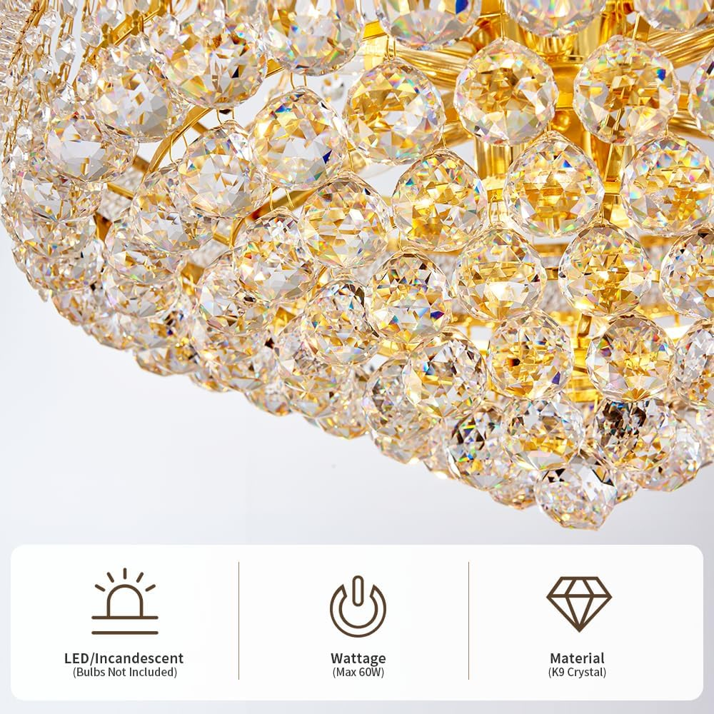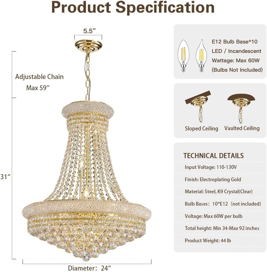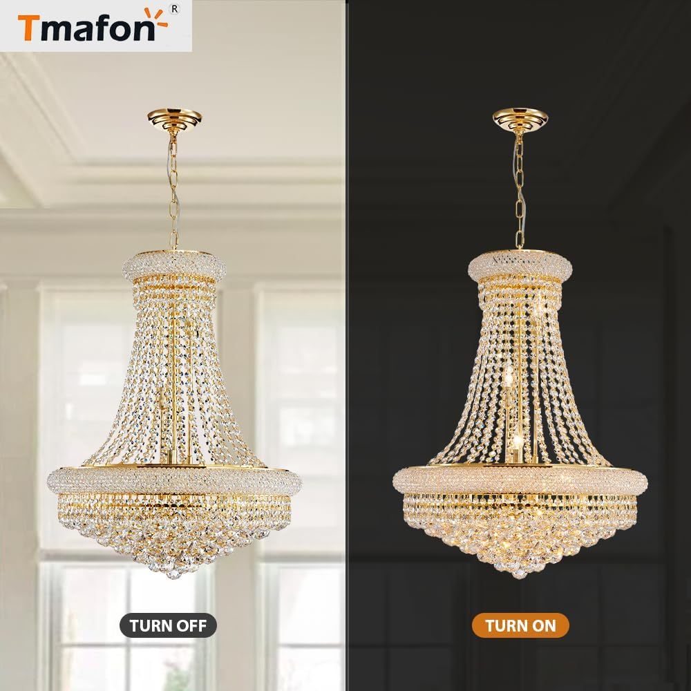 Store New Arrivals Add to Favorite View Feedback Contact Modern Gold Crystal Chandelier Light - Diameter 23.6" Ceiling Haning Chandelier, Pendant Lighting for Living Room, Dining Room, Foyer, Entryway, Hallway Description Item model number TMAZ-10270-D600GD Light Source Type Incandescent, Halogen, Led Style Modern Number of Items 1 Power Source AC Number of Light Sources 10 Country of Origin China Embellishment Crystal Theme Empire chandelier light Batteries Included? No Lighting Method Incandescent, Halogen, Led Maximum Compatible Wattage 60 Watts Indoor/Outdoor Usage Indoor Unit Count 1.0 Count Room Type Bedroom, Living Room, Dining Room, Kitchen, Island, Home Office, Staircase, Hallway, Porch Assembly Required Yes Product Dimensions 23.6"L x 23.6"W x 26.8"H Material Metal Collection crystal chandelier Installation Type small ceiling hanging light Model Name TMAZ-10270-D600GD Finish Type Electrplating Specific Uses For Product House ceiling decoration of Bedroom, Living Room, Dining Room, Kitchen, Island, Home Office, Staircase, Hallway, Porch Fixture Type Removable Bulb Base E12 Water Resistance Level Not Water Resistant Batteries Required? No Item Weight 40.5 pounds Light fixture form Chandelier Special Features Pendant light fixtures Special Feature Pendant light fixtures Part Number TMAZ-10270-D600GD Shade Color gold Mounting Type Ceiling Mount Color Gold Wattage 60 watts Shape Round Voltage 110 Volts Recommended Uses For Product Indoor use only Shade Material Glass, Crystal, Iron Finish types Electrplating Included Components Lamp frame, Chain, Crystals, Ceiling Mounting Canopy Size Diameter 24 inches/2 layers ✔【GLAM DESIGN】Magnificent reflective crystals fall from this glamorous crystal chandelier, enchanting the room with luxury, while displaying an original design. ✔【Chandelier Specifications】This is a medium size empire chandelier, the dimension of Crystal Chandelier is Height 26.8 inches, Width 23.6 inches, You can adjust the length of chains and wires according to your needs(Chain length is 59 inches), chandelier net weight approx 40 pounds ✔【E12 Bulbs】 Bulbs are not included, the K9 Crystal Chandelier Lighting is compatible with any E12 bulb. 10 Bulbs Required. ✔【Easy to Install】Full assembly required with time and effort, but definitely worth it. We provide all mounting hardware and installation manual. If you have any questions, please directly, we will resolve the issue as soon as possible. ✔【100% Satisfaction Guaranty】All electrical parts are American Standard,24-hour customer service to to solve any problems you encounter and 30 days return without worry, 100% Product Description Main Chandelier Information Chandelier Size Dia 23.6 inches, Height 26.8 inches Ceiling Canopy Size Dia 5 inches Metal Chian length 59 inches. Totle height Max 88 inches, Min 30 inches Product Weight Approx 40 pounds Light Source 10 E12 Bulbs (Not included), 110-130V Material Steel(S Gold), K9 Crystal(Clear) Spare Parts Included from TMAFON lighting 2 layers gold k9 Crystal Chandeliers if you are looking for a chandelier for a large spaces and high ceiling, if you like sparkling crystals, that's it! "This chandelier gives the whole house a lavish glamorous look." "This is the nicest chandelier I own, it's empirical of the highest quality the crystals are intricate and beautiful, it's so well made and sturdy, it was easy to set up and put together it's extremely straightforward and so gorgeous at an amazing value!!!" -------Said by other customers Full Covered with 100% Hand Picked Crystals Full covered with crystal, which make the chandelier a lavish glamorous look More reasonable structural proportion, which make the chandeliers to be a "show stopper" in your house! Elegent Luxury Efect Dia 23.6", Height 26.8", with 59" adjustable metal chain Require 10 E12 bulbs(not included in product) Spare parts of crystals included 1 Staircase, Foyer 2 Kitchen Island 3 Dining Room 4 Living Room What is size of this chandelier? Is it suitable for my high ceiling The chandelier body have a size: Dia23.6‘,Height 26.8", with 59" Metal Chain. The totle height with chain could be between: 30"- 88" Will this chandelier be assembed when arriving? For transportation safety, It requires you to assemble the metal frame and hang the crystals, and will take long time. However, It's not complicated, it just requires you to have patience and install chandelier refer to installation manual. What kind of light bulbs do I need to purchase? Because each person has different requirements for the function, power, and color temperature of the light bulb, so the bulbs were not included in this product. Chandelier require 10 pieces E12 bulbs(110V, Max 60W) What is the weight of this luxury chandelier? The package is about 50 lb, and the chandelier is about 40 lb What if any accessories are damaged? We have considered the possible damage that may occur during transportation and installation, there are spare parts in package for some Fragile or easily lost parts. TMAFON Chandelier Light Fixtures Recommendation Add to Cart Add to Cart Customer Reviews 4.6 out of 5 stars 50 3.9 out of 5 stars 36 3.9 out of 5 stars 36 4.7 out of 5 stars 29 5.0 out of 5 stars 1 Price $529.98 $ 529 . 98 $279.98 $ 279 . 98 — — — Finish Gold Gold Gold Black Gold Size D24 inches D24 inches L36 inches D24 inches D31.5 inches Light Bases E12 E12 E12 E12 G9 Install Type Pendant light Semi-Flush Mounted Light Semi-Flush Mounted Light Pendant light Pendant light Material Metal, Crystal Metal, Crystal Metal, Crystal Metal, Crystal Metal, Crystal ABOUT US We offer the best prices around on high quality products. Our E-store includes media such as books, movies, music and games while offering electronics, toys, sporting apparel, clothing, tools, general home, garden items and more. SHIPPING We are always working hard to ensure your package arrives as soon as possible. Please understand that some factors like weather, high po