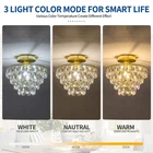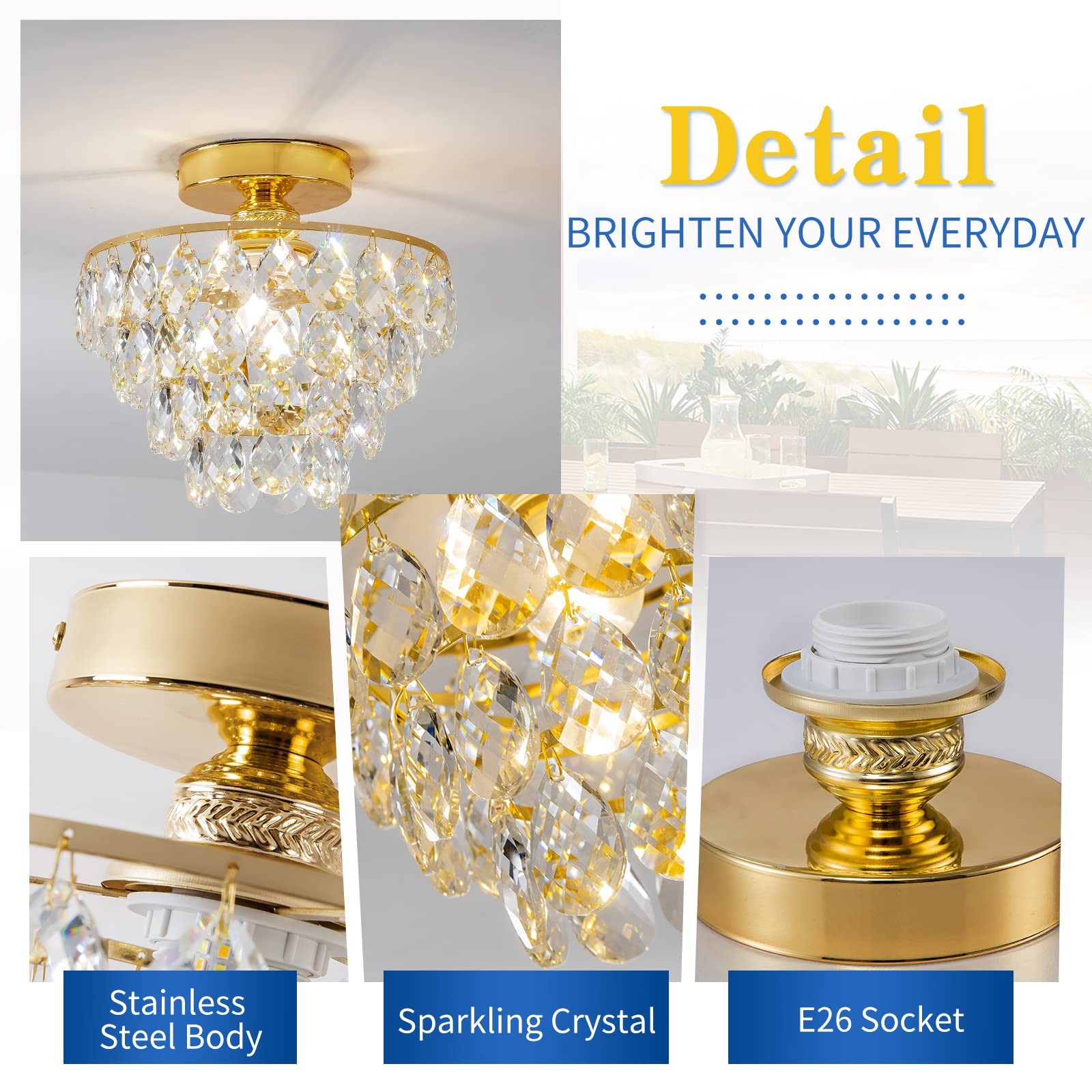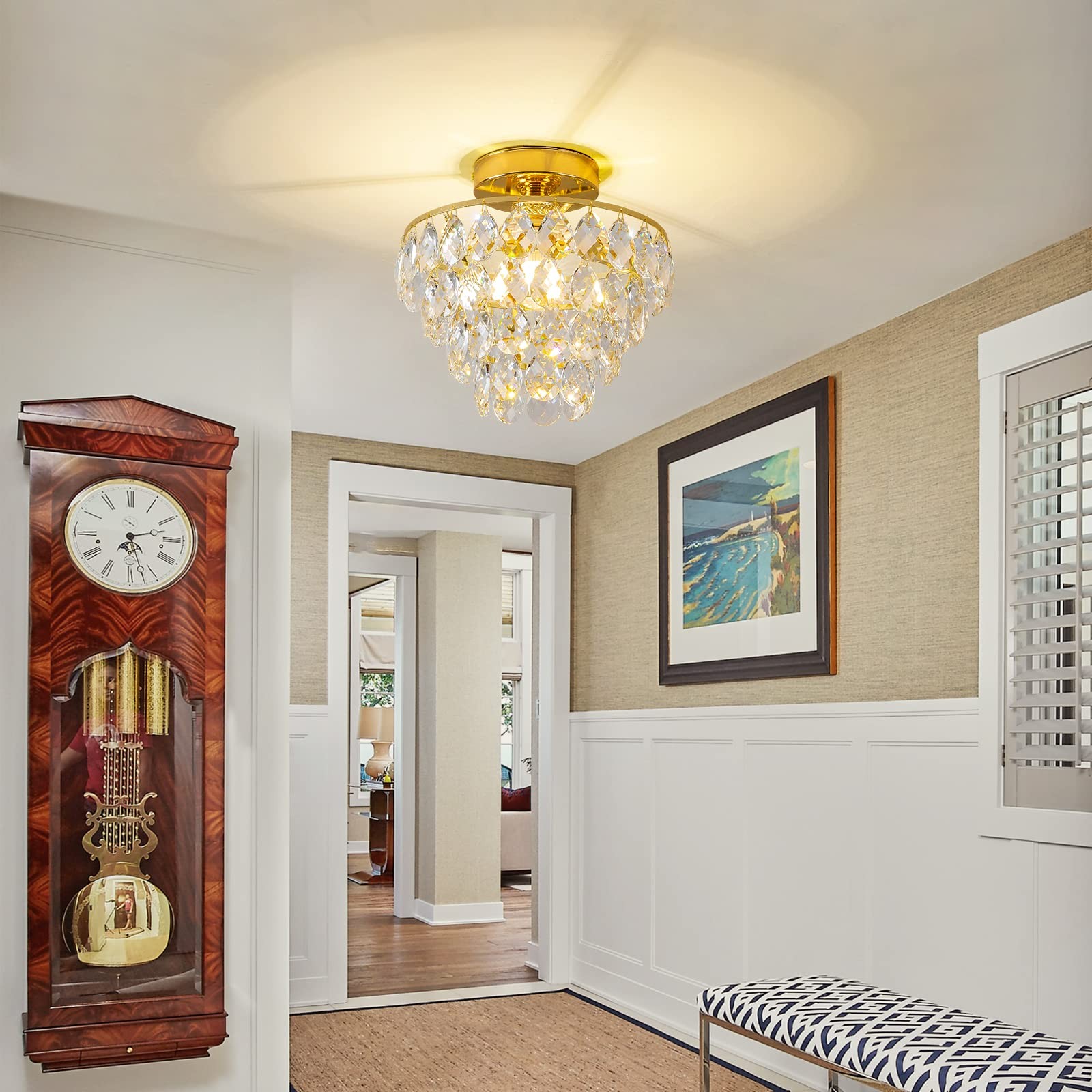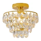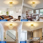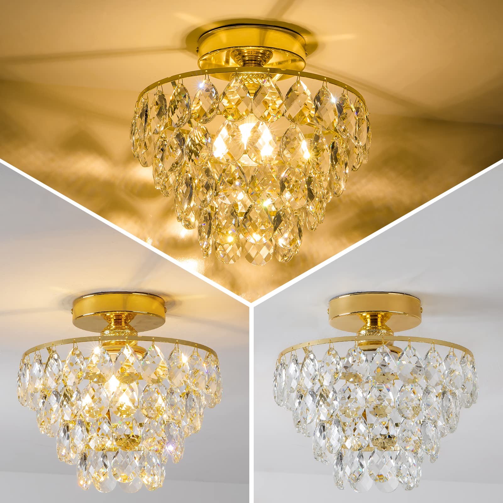 Modern Small Crystal Ceiling Light Fixture Mini Gold Semi Flush Mount Chandelier Light Fixture for Hallway Bedroom Bathroom Closet, E26 Socket 【Modern Design & Unique style】With Elegant Golden finish metal frame, eye-catching crystal raindrop shade, this sparkling crystal ceiling light gives a modern and stylish look for your house. Raindrop glass shade and metal frame collision the fashion sparks, this design complements any home decor such as mid century, modern, contemporary, industrial. It is definitely the best choice for your home lighting and decoration. 【E26 Bulb Sockets】This semi flush mount hanging light is compatible with E26 based bulbs, including LED, CFL, incandescent and halogen bulbs. It is also fully dimmable when used with a dimmable bulb and dimmer switch. You can choose different style bulbs and color temperatures to create different atmospheres. [Note: The Bulb and Dimmer Switch Not Included.] 【Perfect Size & Wide Application】The perfect size of W9.84" x H9.13" provides a great deal of ambient light without sacrificing too much space. They are especially beneficial in low-ceilinged spaces where pendants, chandeliers, or other hanging lights may pose the risk of head-bumps. It is a great choice for nearly any space such as hallway, entryway, living room, bedroom, basement, bathroom, kitchen, also perfect for commercial lighting in restaurants, cafes, shops, etc. 【Premium Quality & Easy to Install】The crystal chandeliers is made of topping durable metal and well-made clear crystals, never need to worry about rust, corrosion or fading. The hardwired and sockets are built with premium materials and circuitry, truly high-quality usage for a long time. This modern ceiling light fixture includes all mounting hardware and instruction for quick and easy installation, save you the hassle of finding compatible accessories. 【Ensured Quality & Service】All ceiling light fixtures covered by worry-free MONEY-BACK & policy. Whatever problems with our lamp, please don’t hesitate to via message box, we will do our best to help you in less than 24 hours.