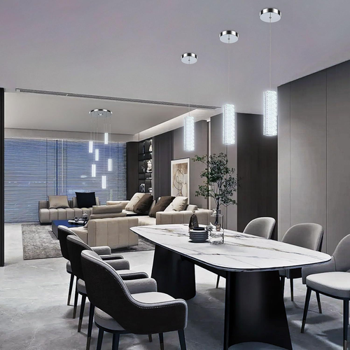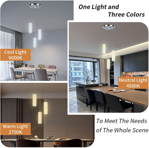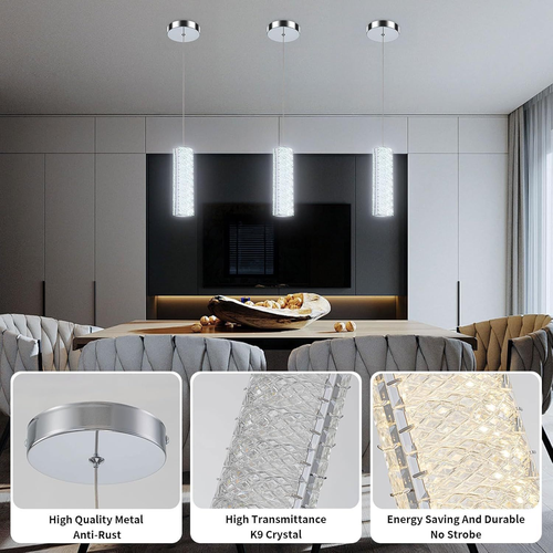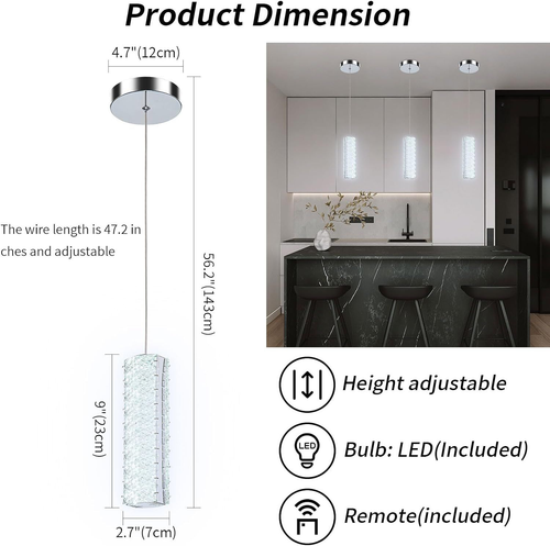 Modern LED Crystal Pendant Lights Kitchen Island with Remote, Adjustable Height Pendant Light Fixtures, Dimmable Chandelier for Dining Room, Bedroom, Living Room, Farmhouse(1 Pack) Product Details Brand: ROMYEAR Color: Chrome 1 Pack Material: Crystal, Stainless Steel Style: Modern Light fixture form: Chandelier Room Type: Bathroom, Bedroom, Dining Room, Entryway, Living Room Product Dimensions: 5"L x 5"W x 47"H Specific Uses For Product: Indoor use only Indoor/Outdoor Usage: Indoor Power Source: AC Installation Type: Flush Mount Special Feature: Adjustable Height,Dimmable,Adjustable Color Temperature,Lightweight, Reticulated curved crystal, refracting diamond-like bright light spots when light penetrates, Suspension aesthetics: suspended in the air like a work of art, instantly stretching the sense of spatial hierarchy, The height is adjustable, which can accurately match the space ratio. Global adaptability to wide voltage 110-240V design., Three-color scenario: remote control one-button switching of warm yellow light, neutral light, and cold white light to meet the needs of multiple scenes Control Method: Remote Light Source Type: LED Finish Type: Polished Shade Material: Crystal Number of Light Sources: 1 Voltage: 110 Volts Theme: Christmas, Love, Music, Space, Wedding Light Color: White, Natural, Warm Shape: Round Included Components: Instruction Manual, Mounting Hardware, Shade Embellishment: Crystal Lighting Method: Downlight Number of Items: 1 Wattage: 8 watts Bulb Base: GU10 Controller Type: Hand Control Switch Type: Push Button Unit Count: 1.0 Count Water Resistance Level: Not Water Resistant Brightness: 500 Lumen Efficiency: 85 lumens per watt Mounting Type: Ceiling Mount Shade Color: Clear Fixture Type: Non Removable Assembly Required: No Manufacturer: ROMYEAR Recommended Uses For Product: Commercial, Daily use, Exhibition, Festival, Hotel, Industrial, Living room, Reading, Restaurant, Retail, Wedding Model Name: ZM-016 Part Number: ZM-016 Item Weight: 1.7 pounds Item model number: ZM-016 Finish types: Polished Special Features: Adjustable Height,Dimmable,Adjustable Color Temperature,Lightweight, Reticulated curved crystal, refracting diamond-like bright light spots when light penetrates, Suspension aesthetics: suspended in the air like a work of art, instantly stretching the sense of spatial hierarchy, The height is adjustable, which can accurately match the space ratio. Global adaptability to wide voltage 110-240V design., Three-color scenario: remote control one-button switching of warm yellow light, neutral light, and cold white light to meet the needs of multiple scenes Batteries Required?: No Color Temperature: 6000 Kelvin Product Dimensions : 5 x 5 x 47 inches; 1.7 Pounds Item model number : ZM-016 Manufacturer : ROMYEAR Brand: ROMYEAR Color: Chrome 1 Pack Material: Crystal, Stainless Steel Style: Modern Light fixture form: Chandelier Modern Crystal Pendant Light with Elegant Design: Crafted with premium chrome-finished metal and crystal, this island lights for kitchen adds instant sophistication to any space. Its versatile design complements modern, farmhouse, industrial, and transitional decor styles, making it a perfect centerpiece for your home. Fully Adjustable Height for Customized Lighting:The kitchen island lighting features a 2.7-inch body diameter with adjustable suspension (9 to 56 inches), allowing perfect height customization for kitchen islands, dining tables, or bedside lighting. This pendant light fixture Compatible with sloped, vaulted, and flat ceilings for universal installation. High-Efficiency LED Lighting with Advanced Features:This kitchen pendant lighting over island equipped with a 24W integrated LED chip delivering 2040 lumens of 6000K crisp cool white light (dimmable,Remote control included). uniform and soft light, no stroboscopic, and long-term use is not easy to cause eye fatigue. The pendant lights supports stepless dimming and can easily switch between bright and warm modes to meet the needs of different scenes. Quick & Hassle-Free Installation:Installing this modern pendant lights kitchen island is a breeze with the provided detailed instructions and hardware accessories. Ideal for kitchen islands, dining rooms, bedrooms, hallways, bars, and cafes – transforms any space in minutes.