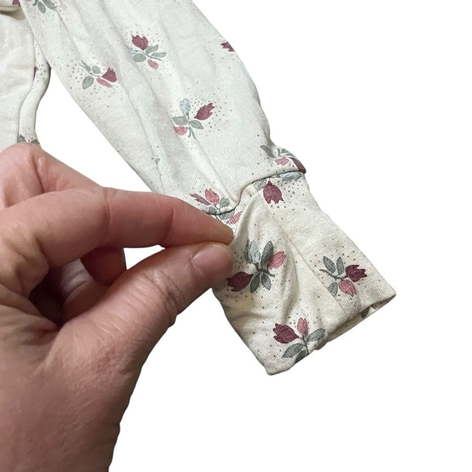 Adorable cream one piece with a charming floral pattern. Perfect for keeping your little one cozy and stylish. Bamboo viscose. Super soft. Comfy one piece long sleeve long pants pajamas In good preowned condition.