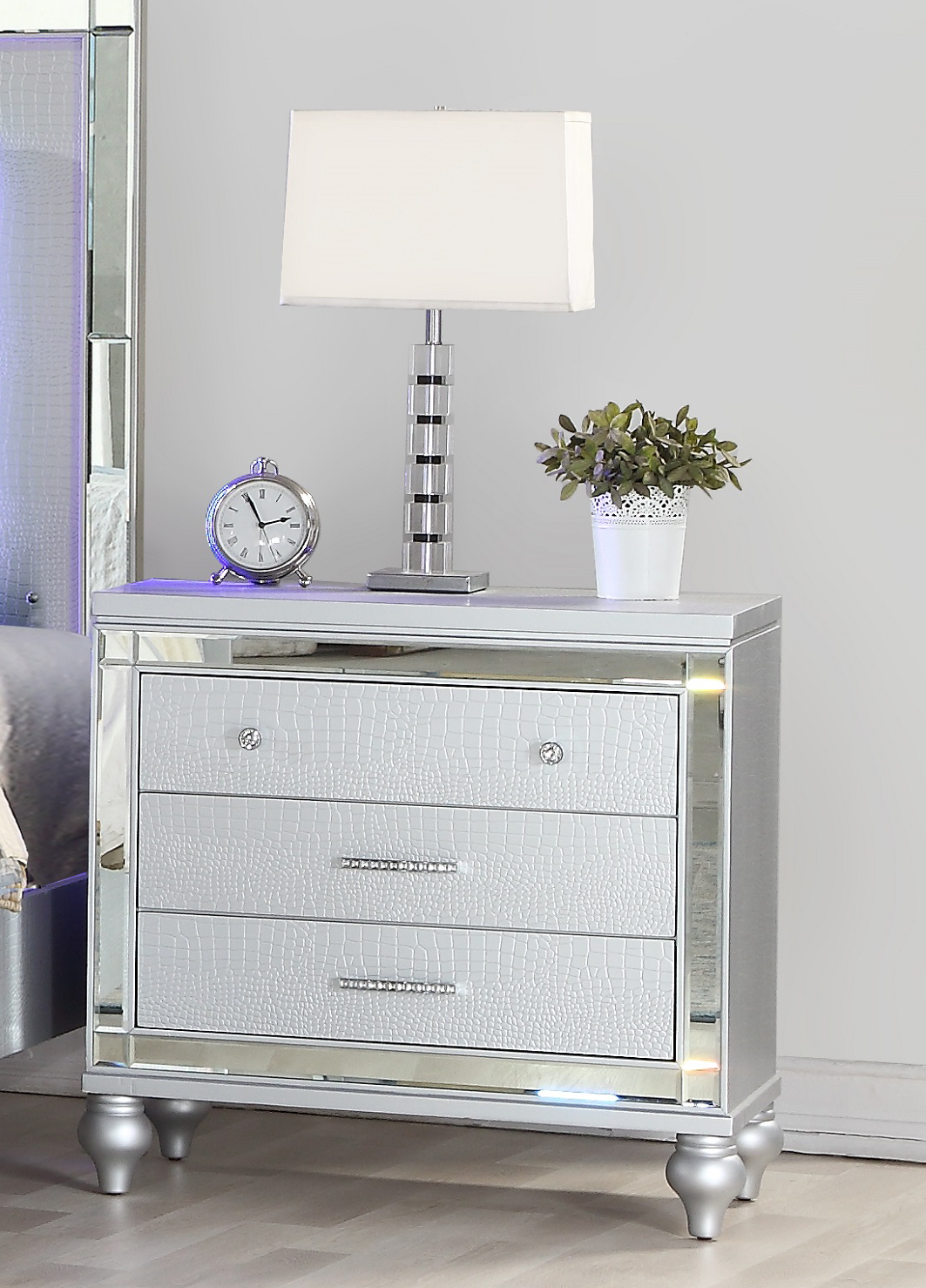 Specifications Place of Origin Viet Nam Main Color Silver Main Material Wood Filler Solid Wood+MDF Product Style Contemporary,Modern Number of Drawers 3 Drawers Use Case Bedroom Wood Type Acacia Features Drawers Product Type Bedside Cabinet Finish Silver Dangerous Goods #dangerFlag# Dimensions & Weights Assembled Length (in.) 17.00 Assembled Width (in.) 26.30 Assembled Height (in.) 28.00 Weight (lbs) 55.12 Product Features Mirror accents and gold-accented hardware add sophistication. Combines functionality and aesthetics, offering convenient storage. Elevates the overall elegance of your bedroom. Number of Drawers: 3 Description The Glamour Elegance Nightstand is both a functional storage solution and a dazzling piece of decor. Its mirror accents bring an air of sophistication to your bedroom. It's perfect for your daily routines, adding a touch of Hollywood glam to your space.