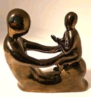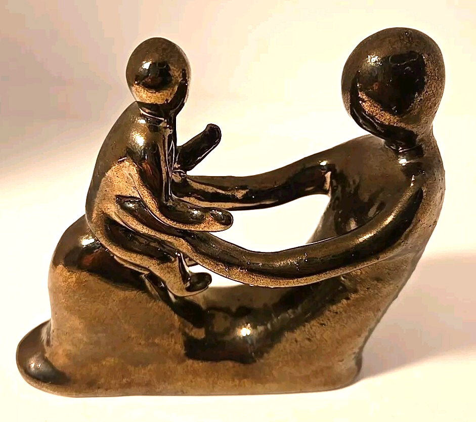 This exquisite sculpture depicts a modernist mother and child engaged in a playful activity. Crafted from bronze and clay, this handmade piece is signed by the artist Joyce Gressett and stands at 5 inches in height and width. The sculpture is an original production from 2002 and is perfect for any contemporary art enthusiast. The sculpture features a minimalist and abstract design that is consistent with modernist art principles. It is a perfect addition to any art collection and can be placed on a table or any other surface. This piece is a must-have for anyone who appreciates the beauty and complexity of contemporary art.