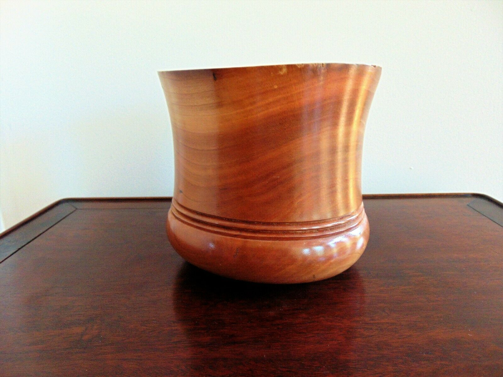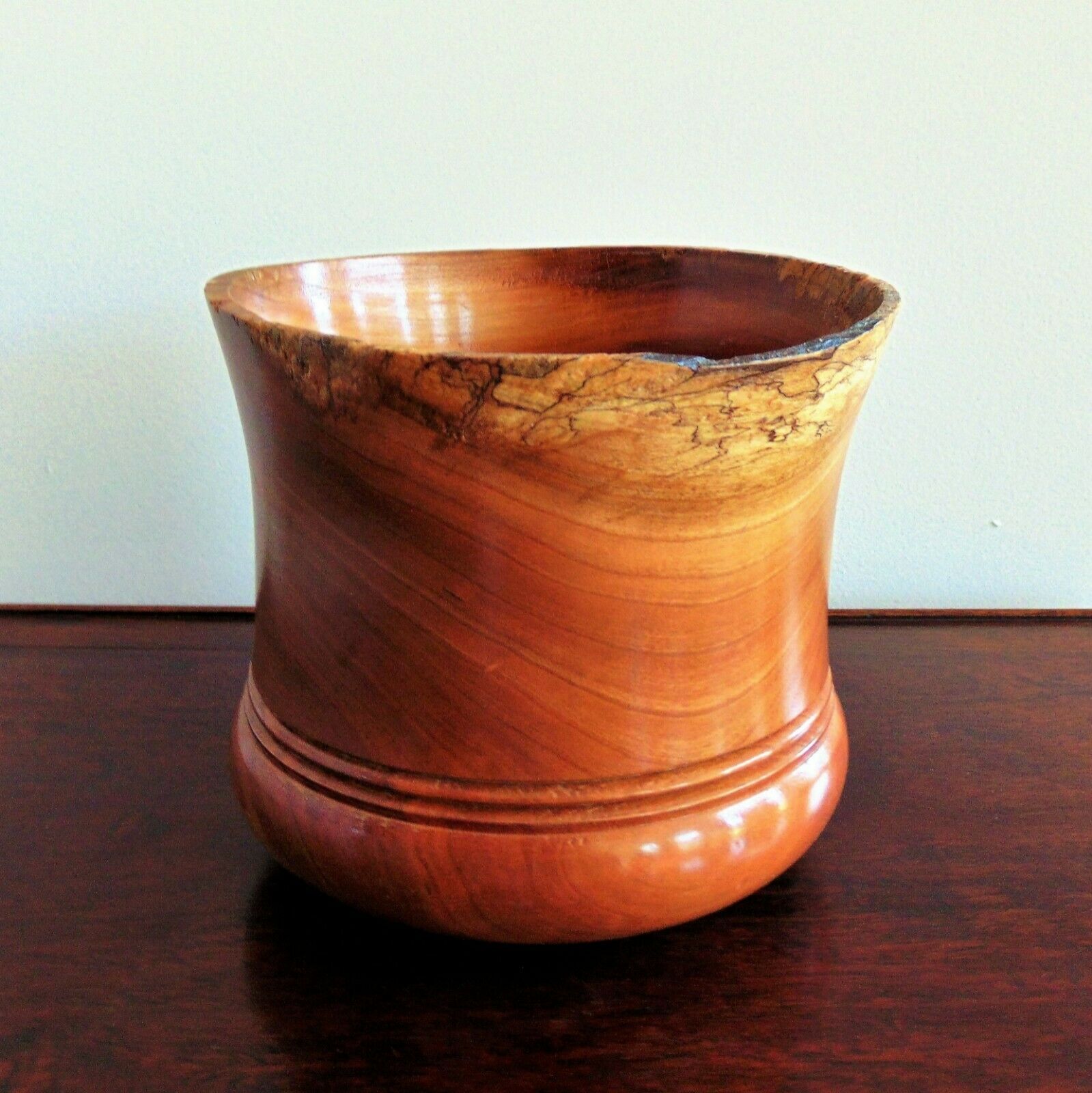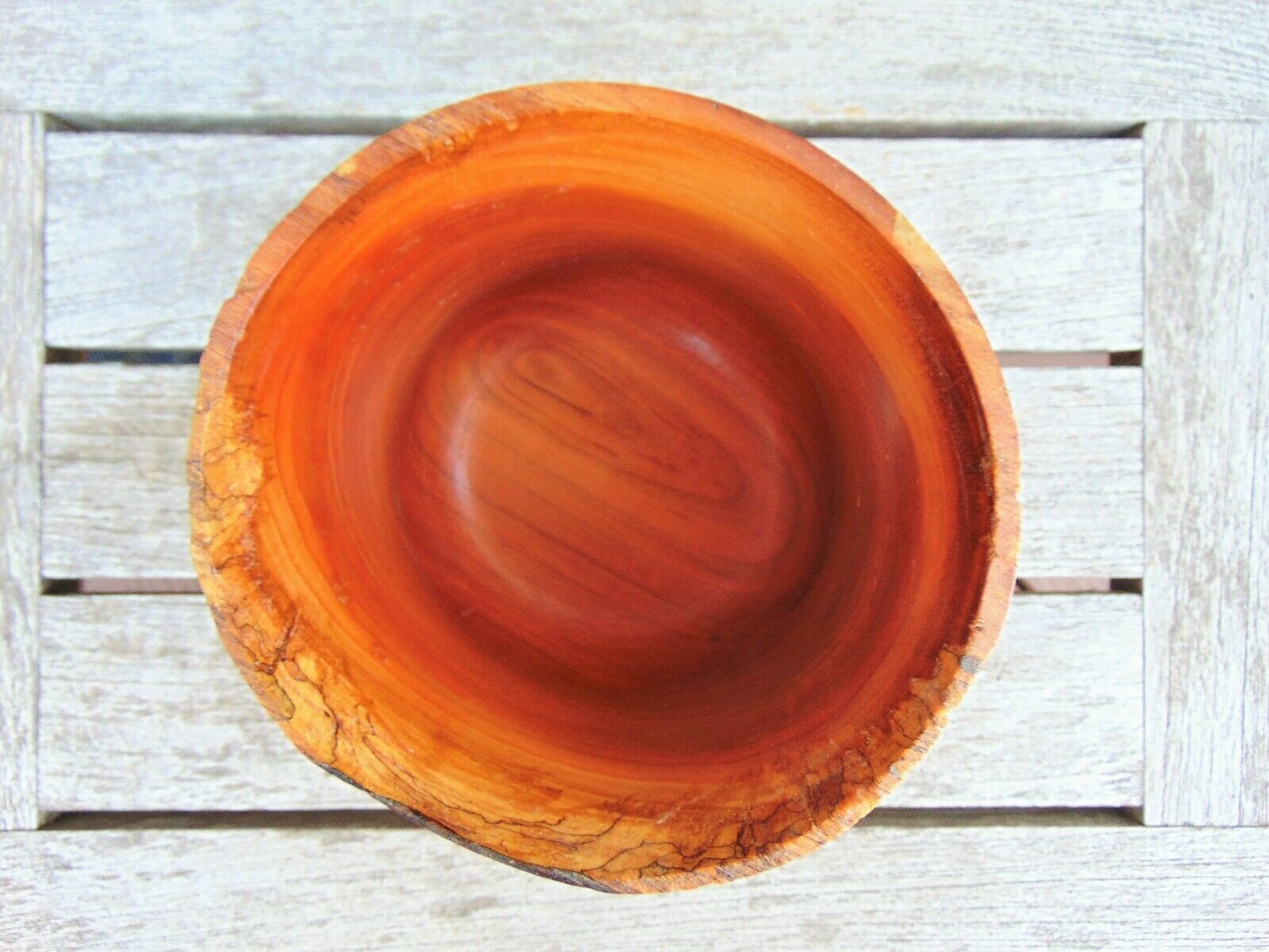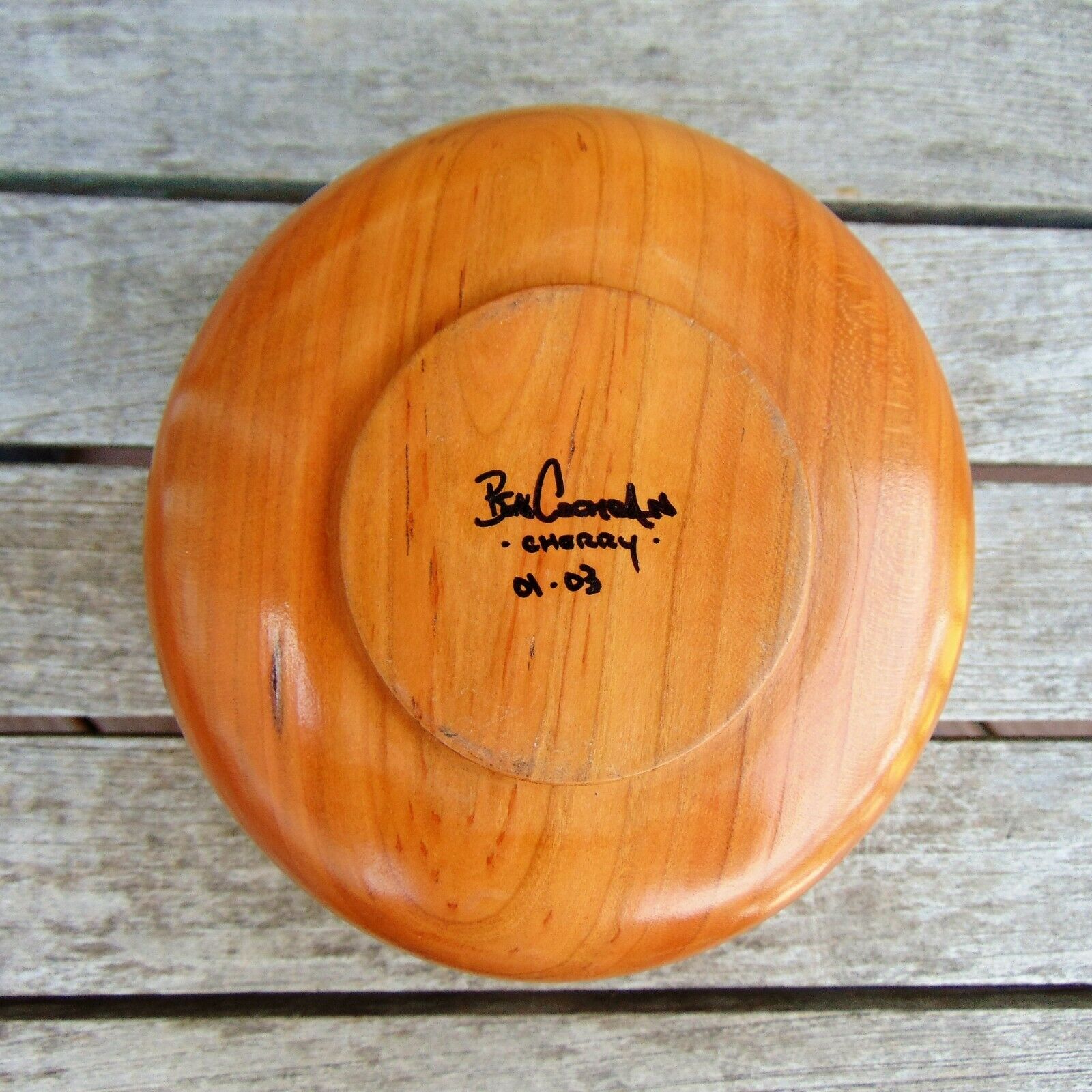 A handmade wooden bowl from highly figured solid cherry heartwood on a raised base. It has an attractive finish that is smooth to the touch. The bowl's rim was intentionally roughly finished. Modernism. Minimalist. Its stiff hardwood is a distinctive color in light to dark reddish brown cherry heartwood. It grows generally through the eastern part of the United States The given wood type is identified on its bottom as cherry (Cherry, Black) along with a signature and date 01-03.