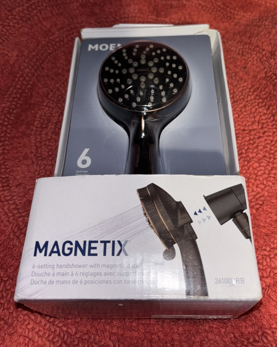 Product Information: Easy to use and attractive, the Magnetix Hand shower is perfect for your bathroom. This innovation offers easy release and return. Magnetix handheld showers are the first MOEN products to include magnetic docking, which allows for easy release and securely snaps back into place - even when your eyes are closed Inspired by patterns found in nature it offers a distinctive design which is at home in any transitional décor. Gracious and uncomplicated style features give the Engage collection an ageless yet fashion-forward presence. Tailored yet relaxed, the Engage collection is an exercise in design balance. This lustrous collection works seamlessly with today's lifestyles. CUSTOMIZE YOUR SHOWER: Multiple (6) distinct shower settings gives flexibility and variety MAGNETIC BASE: The magnetic docking system allows you to easily detach and use as a handheld shower head or effortlessly replace it to dock with the snap of a magnet FLEXIBLE: Features a 60 inch kink-free metal hose that extends reach and flexibility VERSATILE DESIGN: Mediterranean Bronze finish delivers a rich, dark brown, old world finish to your bath. WATERSENSE CERTIFIED: Meets EPA WaterSense criteria to conserve water without sacrificing performance