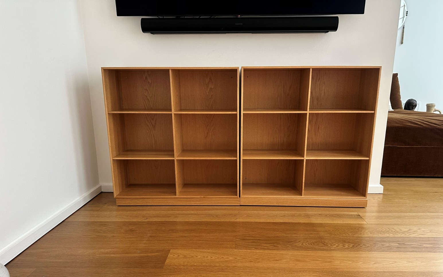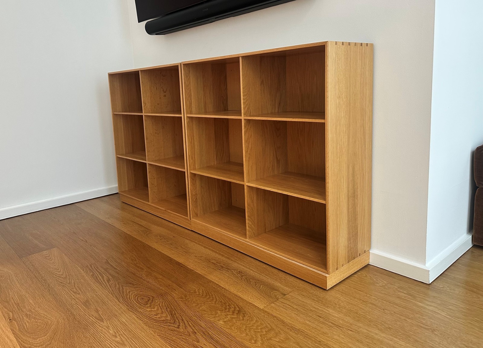 Two (2) Mogens Koch bookcases in Elm with plinths. Dimensions are as follows: Each bookcase is: Width: 30" Height: 30" Depth: 11" Each plinth is: Width: 30" Height: 2" Depth: 11" Contact me with your shipping address if you are interested and I will gladly obtain shipping quotes. The shipping cost included in the listing is just an estimate and will vary based on the destination.