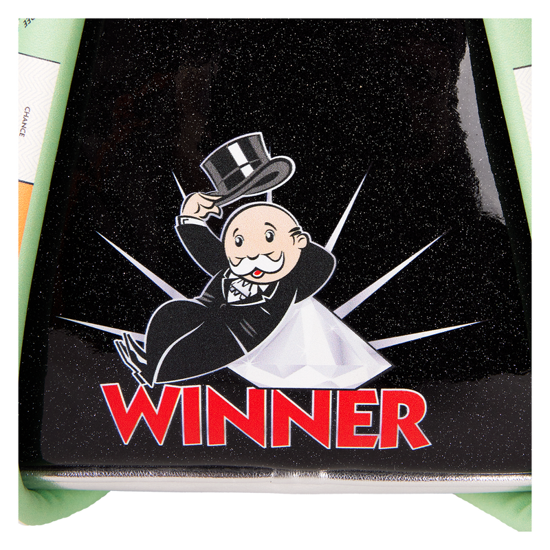 Pass GO and hold onto your hat! Advance to the Boardwalk with this fashionable Monopoly mini backpack, which is perfect for collecting your game winnings. The entire accessory shimmers in glittery black faux patent leather. The front zipped pocket carries details of Mr. Monopoly’s tuxedo jacket and shirt, with a molded metal charm of the Monopoly “M” logo, blinged out in rhinestones. Mr. Monopoly’s applique face and head with top hat rise up over the front pocket—and it appears that he’s making it rain applique Monopoly bills and coins. The adjustable shoulder straps even feature a print of the Monopoly board tiles! On the back, Mr. Monopoly makes an encore appearance as a print next to the word “Winner.” Pack just what you need for a day of touring Marvin Gardens, Park Place, or New York Avenue. Features: Vegan patent leather (polyurethane) Adjustable, padded strap Artwork on the side panels Silver-colored metal hardware Applique, printed, embroidered, molded metal charm, and glitter details Coordinating inside lining Dimensions: 9”W x 10.5”H x 4.5”D 22.9 cm W x 26.7 cm H x 11.4 cm D