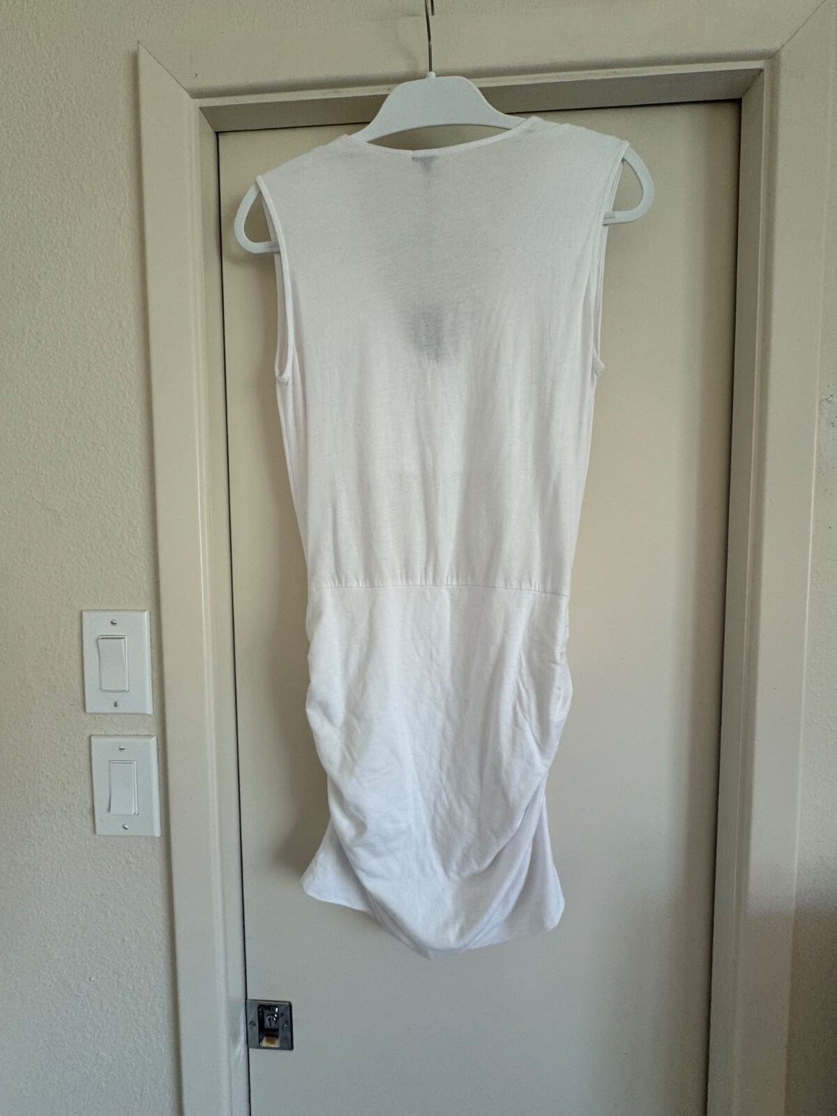 Elevate your wardrobe with the Monrow Women's White V-Neck Rouched T-Shirt Dress, a versatile piece that's perfect for casual outings or your next travel adventure. Crafted from 100% cotton, this dress ensures comfort and breathability, making it an ideal choice for everyday wear. Its sleek white color offers a fresh and clean look, while the bodycon style with a mini length flatters the silhouette.The dress features a classic crew neck and is sleeveless, making it a great fit for warmer days or layering under a jacket when the temperature drops. The size M dress adheres to regular sizing standards, ensuring a true-to-size experience. Whether paired with sneakers for a daytime affair or dressed up with heels for an evening event, this T-shirt dress is a stylish and functional addition to any ensemble.