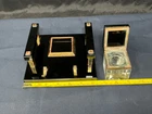 Black onyx crystal inkwell. Piece came from retired Pen Shop. Inkwell appears to be in made by Montblanc. There are no makers marks present (only GERMANY ). Therefore in style of Montblanc. Piece shows wear. Oxidized brass can be seen. Crystal inkwell shows 2 spots with chips (see pictures). Onyx lid also shows 2 chips, some haziness can be seen on the surface. Measures approx 6.25” x 5.75” x 3.5”. Marked on the brass “Germany”. Great Christmas present for any collector , gift for lawyer attorney , young student , father , husband.