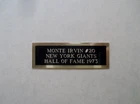 THIS PURCHASE IS FOR THE NAMEPLATE ONLY !!!!!!! BOBBY'S HANG-UPS PREMIUM QUALITY ACRYLIC DISPLAY CASES AND CUSTOM ENGRAVED NAMEPLATES SINCE 1999 THESE NAMEPLATES ARE GREAT FOR DISPLAY CASES, FRAMED AND MATTED PHOTOS AND JERSEYS, SHADOW BOXES, PLAQUES, ETC. WE SPECIALIZE IN CUSTOM ORDERS OF ALL NAMEPLATES. WHETHER IT'S FOOTBALL, BASEBALL, BASKETBALL, HOCKEY, GOLF, BOXING OR ANY PERSONALIZED NAMEPLATE THAT YOU MAY NEED. WE CAN MAKE JUST ABOUT ANY NAMEPLATE THAT YOU ARE LOOKING FOR. PLEASE LIMIT THE AMOUNT OF TEXT TO 3 LINES ON THIS SIZE NAMEPLATE. OUR NAMEPLATES ARE TRIPLE ENGRAVED TO GUARANTEE CRISP, READABLE TEXT. NAMEPLATES ARE HAND POLISHED BEFORE SHIPPED TO MAKE SURE THE ENGRAVING REALLY STANDS OUT. ALL NAMEPLATES HAVE HIGH QUALITY DOUBLE SIDED TAPE TO ENSURE IT WILL STAY IN PLACE. CLICK HERE AND GO VISIT OUR EBAY STORE FOR MORE GREAT ACRYLIC DISPLAY CASES AND ENGRAVED NAMEPLATES !!!! PLEASE CHECK OUT OUR EBAY STORE, AND CHECK OUT ALL OF OUR ACRYLIC DISPLAY CASES AND NAMEPLATES. IF YOU DON'T SEE THE NAMEPLATE YOU ARE LOOKING FOR OR IF YOU ARE LOOKING TO PLACE A CUSTOM ORDER, PLEASE FEEL FREE TO EMAIL US AND WE WILL GET WORKING ON YOUR ORDER RIGHT AWAY. THANK YOU! THIS PURCHASE IS FOR A MONTE IRVIN NAMEPLATE. IT IS BLACK ON BRASS BACKED ON POLISHED GOLD PLATING. THE NAMEPLATE MEASURES APPROX 1"x 3" IN TOTAL WITH ENGRAVED TEXT THAT READS: MONTE IRVIN #20 NEW YORK GIANTS HALL OF FAME 1973 IF YOU ARE PURCHASING DIFFERENT TEAM OR PLAYER NAMEPLATES, AND DIFFERENT SIZES AT THE SAME TIME, PLEASE US THE SHOPPING CART FEATURE, AND PLEASE REQUEST A TOTAL BEFORE MAKING PAYMENT TO ENSURE YOU GET THE PROPER COMBINED SHIPPING DISCOUNT. Be sure to add me to your favorites list !