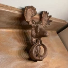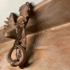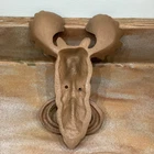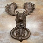Moose Head Knocker used and in good condition. 9”L x 6 1/2”W x 2 3/4”Depth(Moose head). Oval knocker is 4”W x 3”L. This is cast iron and weighs 2lbs 5oz. The color is brown.