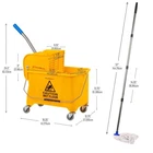 Effortless Mopping: The upward press wringer allows you to bring the handle towards you, reducing the need to bend over while wringing the mop. The mop is the perfect size for the wringer, taking the guesswork out of selecting the right mop Portable and Compact: Equipped with non-marking caster wheels, you can effortlessly roll the bucket while mopping. It has a metal handle and it's compact size stores easily in a closet when not in use Built to Last: The mop bucket is constructed with a durable polyethylene body that is resistant to corrosion, ensuring its longevity even with frequent use. You can rely on this mop and bucket set to withstand the rigors of everyday cleaning tasks Keep it Clean: The upward press efficiently extracts excess water from your mop. A removable panel keeps the clean water separate from the dirty water. This compact bucket is not intended to be used with a large commercial mop Dimensions: After assembly, this mop bucket measures 16. 25" long x 10. 57" wide x 24. 5" high (41. 28 x 27. 31 x 62. 23 cm). The mop comes in four easy to screw together pieces and measures 57" long when assembled Effortless Mopping: The upward press wringer allows you to bring the handle towards you, reducing the need to bend over while wringing the mop. The mop is the perfect size for the wringer, taking the guesswork out of selecting the right mop Portable and Compact: Equipped with non-marking caster wheels, you can effortlessly roll the bucket while mopping. It has a metal handle and it's compact size stores easily in a closet when not in use Built to Last: The mop bucket is constructed with a durable polyethylene body that is resistant to corrosion, ensuring its longevity even with frequent use. You can rely on this mop and bucket set to withstand the rigors of everyday cleaning tasks